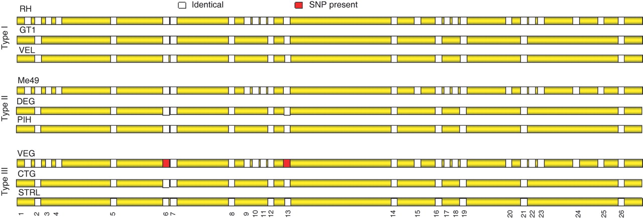 Composition of chrIa for clonal (I, II, III) strains based on sequence analysis of 26 regions. Yellow represents areas not sequenced in the alternative strains, white represents sequenced areas that are identical to RH and ME49, and red represents regions containing a single SNP. Twelve regions are represented in all nine strains. Only two SNPs are seen in these 12 regions, which represents a total of 86,814 bp of sequence across the nine strains.