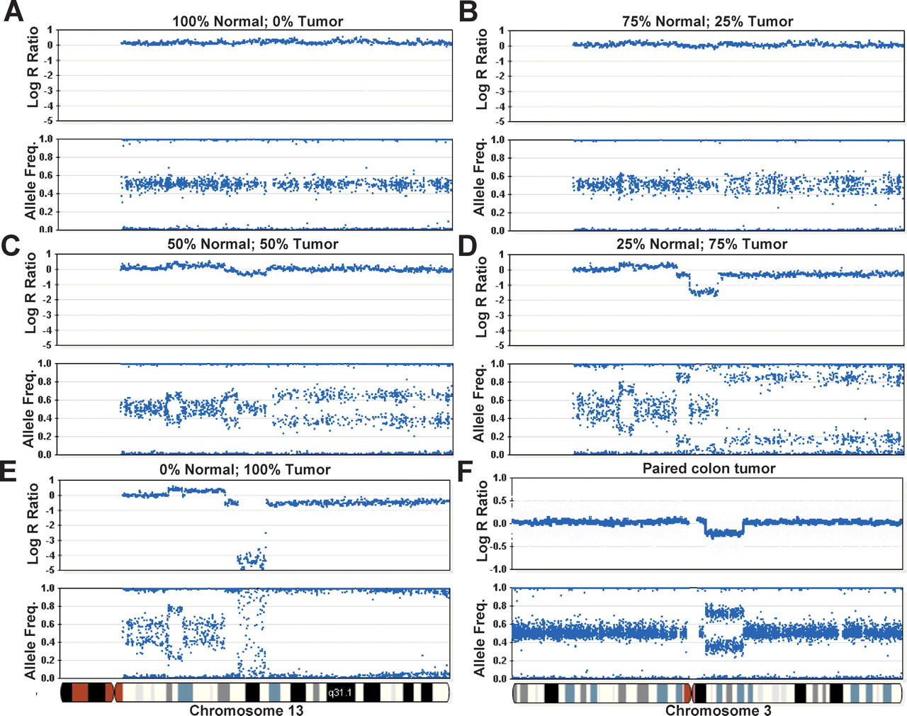 Analyzing heterogeneous tumor samples. DNA from a tumor cell line was mixed with matched normal DNA at ratios of 0%, 25%, 50%, 75%, and 100% and analyzed on the Human-1 (109K) BeadChip. The genome profile of chromosome 13 is shown as an example. (A) No aberrations are seen in the sample containing 100% normal gDNA. (B) No discernable differences in the log R ratio are seen in a sample composed of 75% normal and 25% tumor. It is also difficult to determine if there are any changes in the allelic frequency. (C) At 50% normal and 50% tumor DNA, deflections in the log R ratio appear. Changes in the AF are also seen, although it is difficult to establish the nature of each aberration. At these levels, an allelic duplication event and allelic LOH bear resemblance to each other. (D) At 25% normal and 75% tumor gDNA, the nature of each type of aberration becomes more apparent. For example, the large decrease in the log R ratio in the center of the plot denotes a potential region with a deletion, which was not easily discernable in C. (E) The genoplot from a pure (100%) tumor sample. A homozygous deletion can be seen in the center of the plot, visualized by a decrease in the log R ratio. (F) A region exhibiting LOH is observed on chromosome 3 in a paired colon tumor patient sample analyzed on the HumanHap300 BeadChip. A decrease in the log R ratio indicates a loss of copy number. The AF is divided into two populations(∼0.33 and ∼0.67), suggesting that this sample contains ∼67% normal cells. The blue line shown for all log R ratio profiles indicates a 250-kb and a 100-kb moving median for the Human-1 and HumanHap300 BeadChips, respectively.