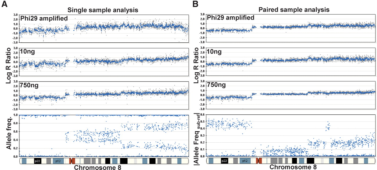 Paired versus single sample analysis. Varying starting inputs of DNA (10 ng and 750 ng) from a paired breast tumor cell line were hybridized to a multisample BeadChip containing a subset of loci (∼33,000) from the HumanHap300 product. In addition, Phi29 was used to amplify 10 ng of gDNA, and 750 ng of this amplified product was used in the initial whole-genome amplification step. Overall, we find that the effect of different inputs of gDNA on the resulting genomic profiles is ameliorated by paired-sample analysis. (A) In the single sample mode, the variability (standard deviation) in the log R ratio is shown as gray dots for Phi29-amplified gDNA, 10 ng of input DNA, and 750 ng of input gDNA (from top to bottom). (B) In the paired-sample mode, the variation in the log R ratio across chromosome 8 is reduced for the same samples. For reference, the AF for the tumor sample is shown on the bottom left and the |Allele Freq subject-reference| for the same tumor sample with paired analysis is shown on the bottom right. Using paired-sample analysis, the allele frequency difference between normal and tumor genotypes is very distinct. Where applicable, a 500-kb moving median was used (blue line).