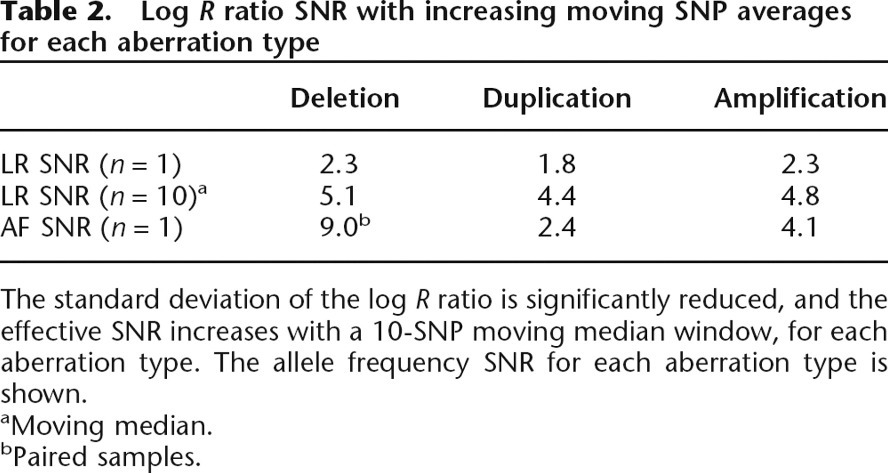 Log R ratio SNR with increasing moving SNP averages for each aberration type