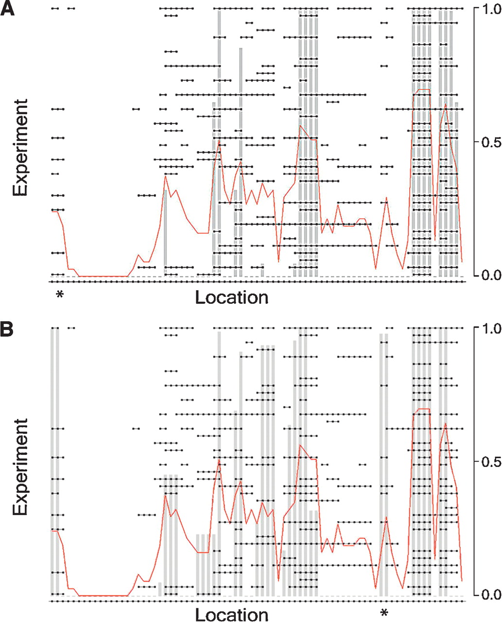 Results for example data using frequency and footprint statistics. Display showing data from Figure 1 with overlay of the confidences, indicated by gray bars. The red line graphs the actual frequencies in the sample set. (A) Frequency only. (B) Footprint only.