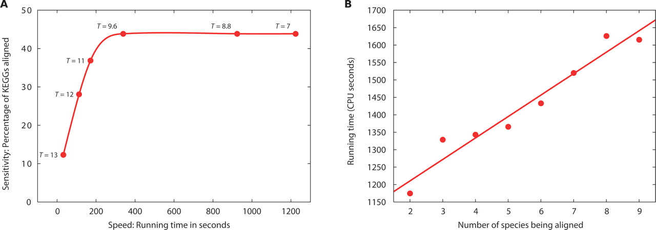 Running-time performance of Græmlin. (A) The speed sensitivity trade-off. Each point represents a run of Græmlin with d = 4 and different values of T. For each set of parameters, the x-axis plots the running time, and the y-axis plots the fraction of alignable KEGGs hit. (B) Progressive multiple alignment. Beginning with E. coli, we added species of increasing evolutionary distance to the multiple alignment. The pairwise running time is comparatively high because the two species aligned, E. coli and S. typhimurium, are the two most similar species and have many high-scoring alignments. In this manner, adding particularly close species to the alignment can lead to higher-than-average increases in running time, but over all species the average scaling will remain roughly linear.