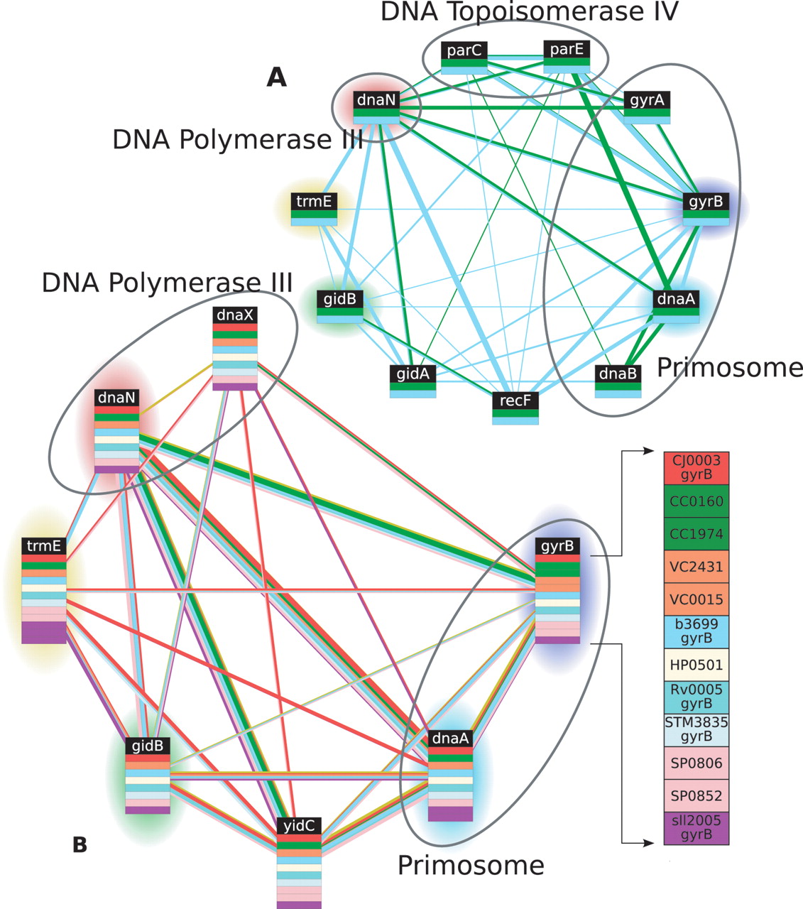 Two alignments of proteins involved in DNA replication. (A) A pairwise alignment between E. coli and C. crescentus includes several proteins involved in cell division as well as a conserved thiophene and furan oxidation protein. (B) A multiple alignment extends the pairwise alignment to include S. typhimurium, V. cholerae, C. jejuni, H. pylori, M. tuberculosis, S. pneumoniae, and Synechocystis. In this and subsequent figures, each colored box represents a protein and each vertical array of boxes represents an equivalence class; Græmlin hypothesizes that proteins in the same equivalence class performed the same function in the most recent common ancestor of the aligned species. To avoid clutter, individual proteins are not labeled, and, instead, each equivalence classis labeled with the consensus gene name of the proteins in it; as an example of the set of proteins aligned in an equivalence class, the detailed inset shows the specific proteins aligned to gyrB. Each protein is colored according to species, using the color code in Table 1; edges are also colored using the same scheme, and the width of each edge is proportional to its weight. In this figure, equivalence classes in the multiple alignment are highlighted the same color as the pairwise equivalence classes that they subsume.