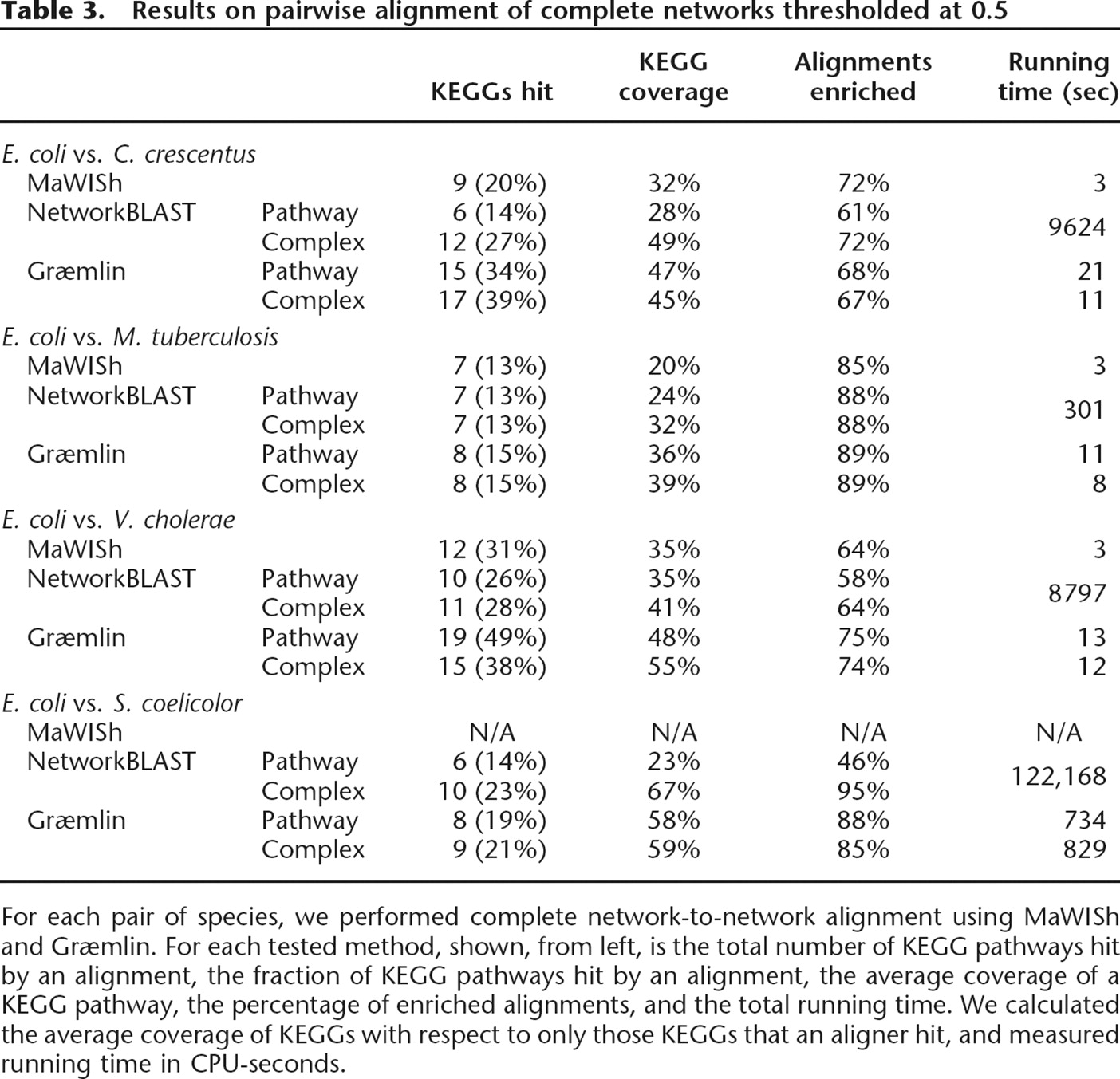 Results on pairwise alignment of complete networks thresholded at 0.5