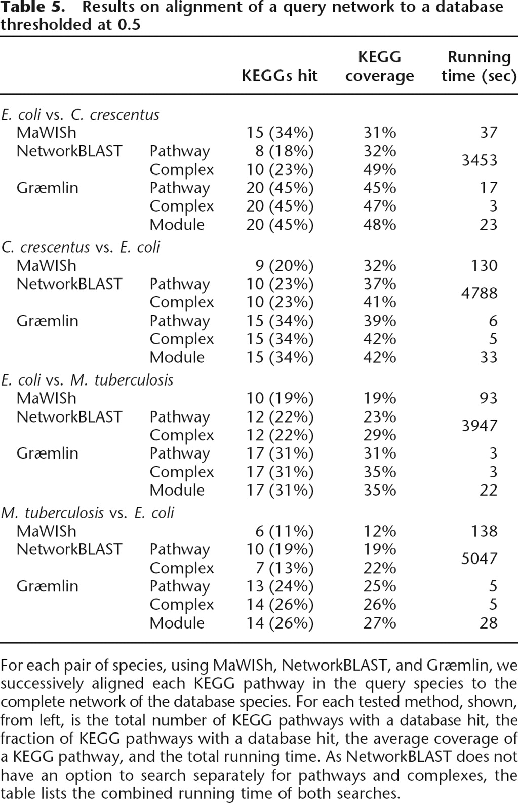 Results on alignment of a query network to a database thresholded at 0.5