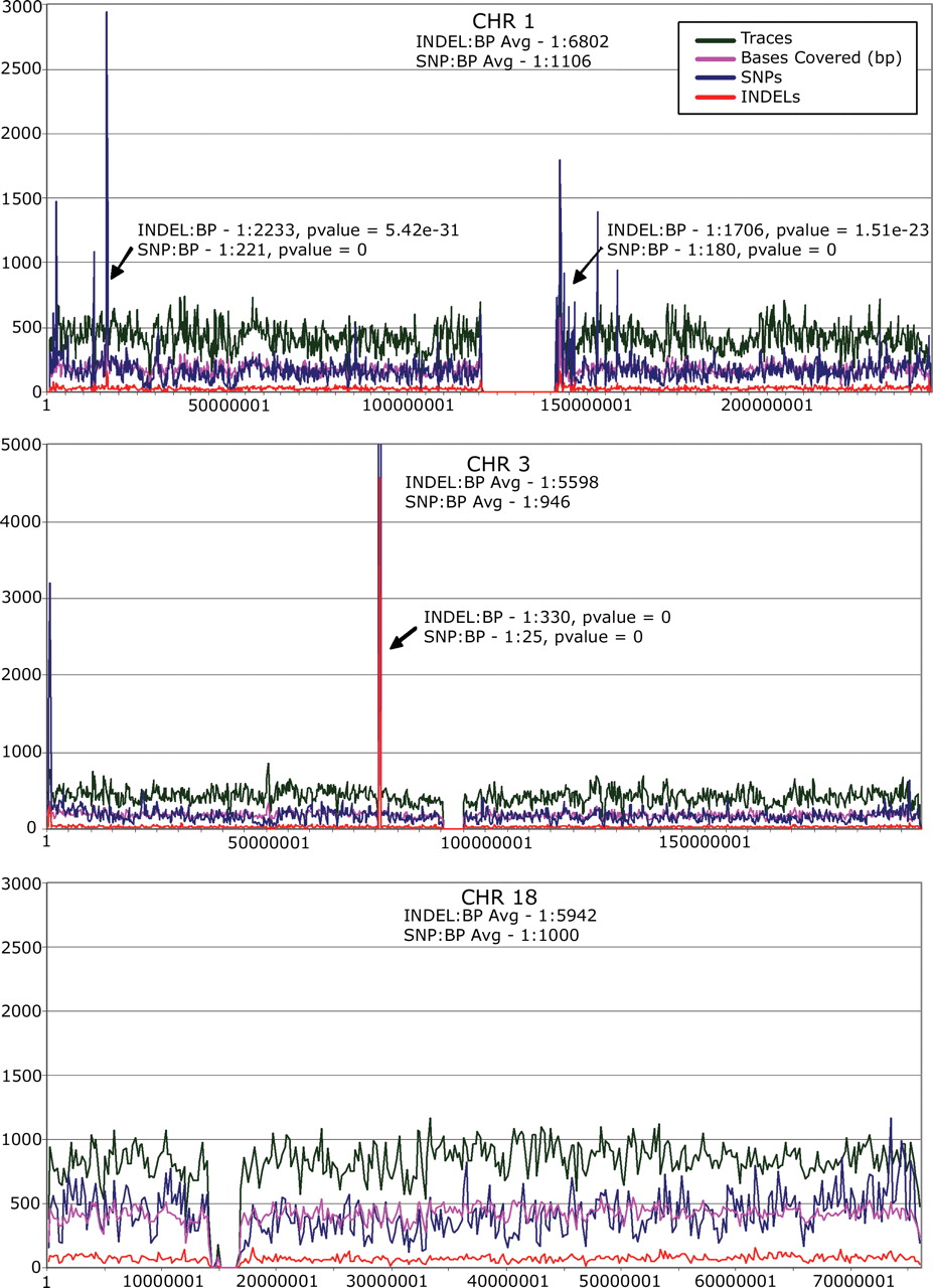 Fine-scale maps of chromosomal INDEL and SNP variation. INDEL and SNP variation graphs are shown for 200 kb bins across chromosomes 1, 3, and 18. The number of traces mapping to each bin and the number of trace bases in each bin also are charted. Chromosome 1 has several large variation hotspots in which the INDEL and/or SNP variation levels are elevated. Chromosome 3 has one large variation hotspot along with smaller hotspots. Chromosome 18 lacks large hotspots. The color key is indicated in the top panel. Similar graphs were generated for all human chromosomes and are found in Supplemental Tables chr1–chrY.