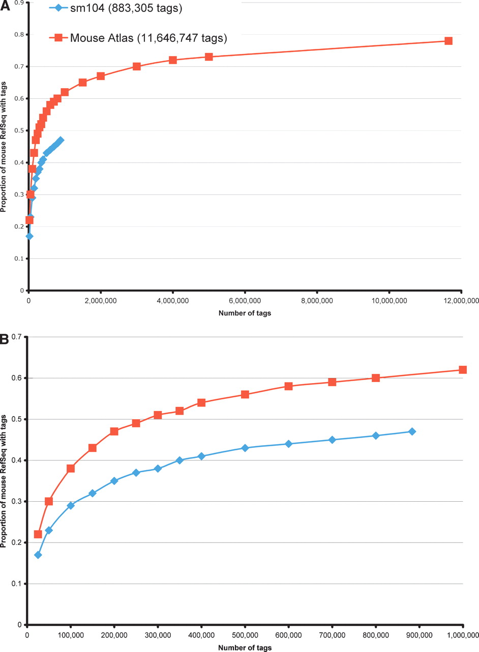 Coverage of the mouse Reference Sequence (RefSeq) data set. The proportion of entries in the mouse RefSeq database represented by a LongSAGE tag in a deeply sampled LongSAGE library (sm104 kidney, >800,000 tags; blue diamonds) and in a meta-library of Mouse Atlas tags (>11,000,000 tags; red squares) is shown. Plotted on the y-axis is the proportion of RefSeq covered. The number of tags is plotted on the x-axis. (A) With sequential sampling, performed computationally, both data sets exhibit rapid coverage of a subset of RefSeq as tag count increases. As expected, the meta-library exhibits superior coverage. (B) The same data, but with an expanded scale along the x-axis to better display the kidney library data.