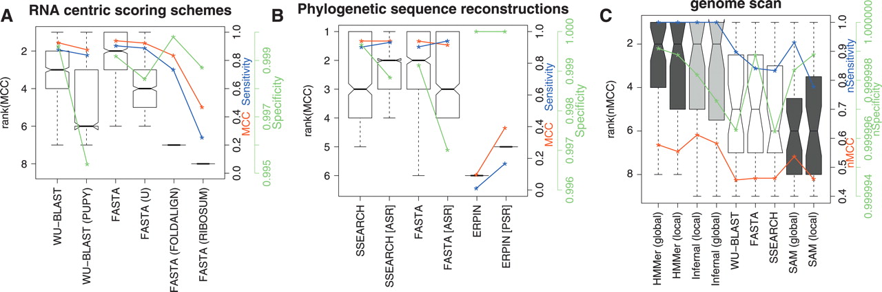 A comparison of the accuracy of methods using RNA-centric scoring matrices, phylogenetic sequence reconstructions, and the genome scan results. (A) A comparison of the accuracy of sequence-based methods with score matrices optimized for ncRNA. These boxplots show the distributions of the ranks on MCC for each of the homology search methods when using one of WU-BLAST (W7), WU-BLAST (W7, PUPY), FASTA, FASTA (U), FASTA (RIBOSUM), or FASTA (FOLDALIGN). These matrices are discussed in more detail in the text. (B) A comparison of FASTA, SSEARCH, and ERPIN with and without phylogenetic sequence reconstructions included in the input. Ancestral sequence reconstruction was used in the case of FASTA and SSEARCH and posterior predictive sequences in the case of ERPIN. Both A and B show results using 5 query sequences. (C) A set of representative programs from each category were run on human chromosome 12 (coordinates 90,000,000–130,000,000; ver NCBI35). The boxplot displays algorithm ranks; additionally, median nMCC, median nSensitivity, and median nSpecificity for each algorithm are displayed using the y-axis on the right. The single sequence, profile HMM, and RNA methods are displayed in unshaded, dark shaded, and lightly shaded boxes, respectively.