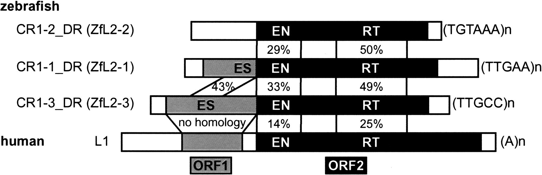 Schematic representation of the NLRs analyzed in this study. ORF1 and ORF2 are shown in gray and black, respectively. The terminal repeats are shown on the right. The endonuclease, reverse transcriptase, and esterase domains are shown as EN, RT, and ES, respectively. The percentages indicate amino acid identities between any two proteins.