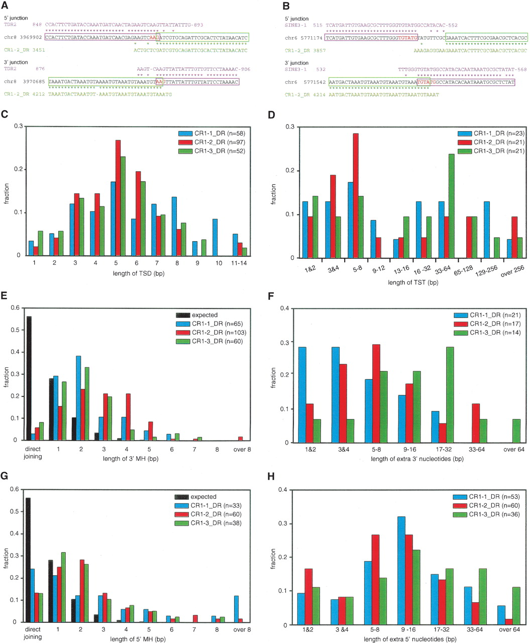 Analysis of integrants of CR1_DRs. (A,B) Two examples of CR1–2_DR integrants. The consensus sequences of the host transposons (magenta, TDR2 in A and SINE3–1 in B), the sequences of parts of the zebrafish genome (black), and the CR1–2_DR consensus sequence (green) are aligned. Asterisks indicate identical sequences, and the magenta and green boxes indicate the regions of CR1–2_DR and host transposons inferred from the alignments. The TSD is shown in red letters. The two integrants have TSDs and 3′ MHs. The example in A has 5′ MH, whereas the example in B has an insertion of extra 5′ nucleotides. (C,D) Length distributions of TSD (C) and TST (D) of CR1_DRs. The colors that discriminate each CR1_DR are indicated in the key in each panel, with the total numbers of CR1_DRs analyzed in parentheses. (E,G) Length distributions of MH at the 3′ (E) and 5′ (G) junctions. The probability distribution of the MH length for two random sequences was calculated as described previously (Roth et al. 1985) and is shown in black. The P values for expected and observed numbers were ≪0.01 in all χ2 tests. (F,H) Length distributions of extra nucleotides at the 3′ (F) and 5′ (H) junctions.
