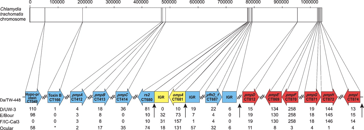 Mosaic structure of Da/TW-448. The linear representation of the ∼1.05 Mb chromosome and nucleotide location (vertical lines) of the 17 sequenced loci are shown. Reference strains involved in the Da/TW-448 mosaic are shown in colored boxes: blue (F/IC-Cal-3), yellow (D/UW-3), and red (A/Har-13, B/TW-5, Ba/Apache-2, C/TW-3), below which is the genetic distance between Da/TW-448 and the reference strains. Vertical arrows represent statistically confirmed and putative crossover regions. The chart shows the genetic distance (based on the number of nucleotide differences) between Da/TW-448 and D/UW-3, E/Bour, F/IC-Cal3 and the mean of the ocular reference group (strains A, B, Ba, and C) for each genomic region analyzed. *CT166 (toxin B-related protein) was included as it represents 2865 bp for trachoma strains (except B/TW-5, which does not contain this gene), and 1920 bp for urogenital reference strains.