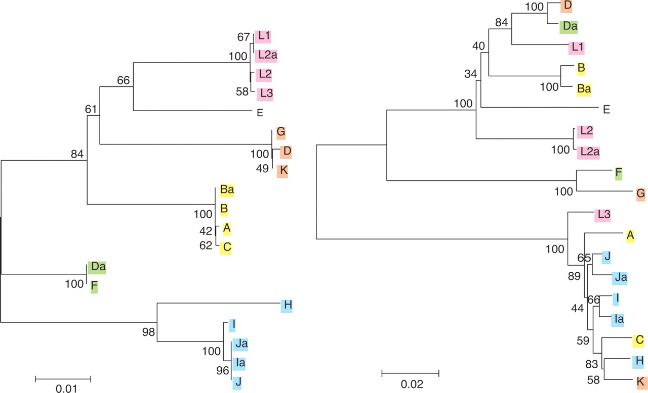 Phylogenetic reconstructions. Reconstructions of the evolutionary history of (left) CT049 and (right) ompA are based on the respective genomic sequences of C. trachomatis reference strains. Strains are color-coded based on the main lineages of the CT049 tree. Strains responsible for the three different disease groups of C. trachomatis (A, B, Ba, and C for trachoma; L1, L2, L2a, and L3 for invasive STDs; and H, I, J, Ja, I, and Ia for noninvasive STDs and likely persistent infection; Dean et al. 2000) form distinct clusters in the CT049 tree, but not in the ompA tree. They also cluster in trees for CT166 and pmpC (see Supplemental material), indicating the possibility of a clonal frame to which ompA does not belong (see Discussion). The values at the nodes are bootstrap that support levels representing the percentage of 1000 bootstrap resamplings in which the strains to the right form a clade. Amino acid trees (data not shown) are similar to the nucleotide trees.