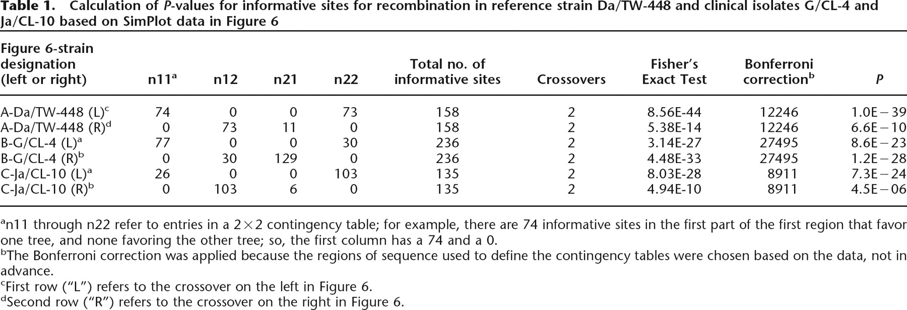 Calculation of P-values for informative sites for recombination in reference strain Da/TW-448 and clinical isolates G/CL-4 and Ja/CL-10 based on SimPlot data in Figure 6