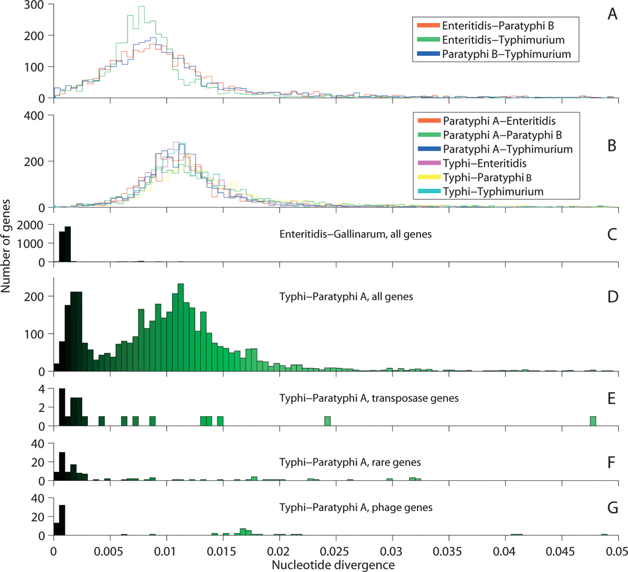 Gene-by-gene divergence levels between pairs of genomes of Salmonella enterica. The histograms show the distribution of divergence levels for each gene as estimated by the changepoint model. The intensity of green is proportional to the divergence level up to 2% and is used in Figure 2. Pairwise comparisons, showing respectively unrelated S. enterica genomes excluding Typhi or Paratyphi A (A), the same genomes with Typhi and Paratyphi A (B) and of the closely related Enteritidis and Gallinarum genomes (C). The Typhi versus Paratyphi A comparison showing all genes (D) and homologous transposase genes (E), rare genes (F), and phage genes (G).