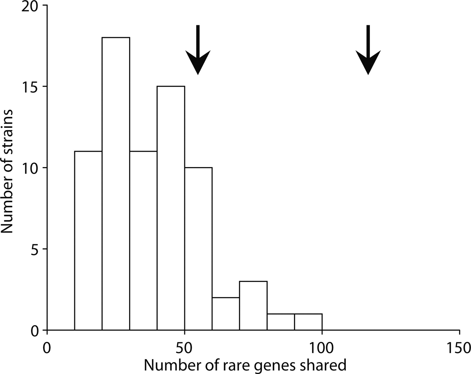 Histogram of the number of rare genes (as defined in the main text) shared by Typhi CT18 and other strains of S. enterica. The arrow at 120 shows the number of genes shared between Typhi and Paratyphi A while the arrow at 55 shows the projected number of genes if the whole genome had the same frequency of rare genes as the high-divergence regions. Note that we have excluded the large SPI7 region, which is shared between Typhi and a handful of other strains. The data is from Porwollik et al. (2004).
