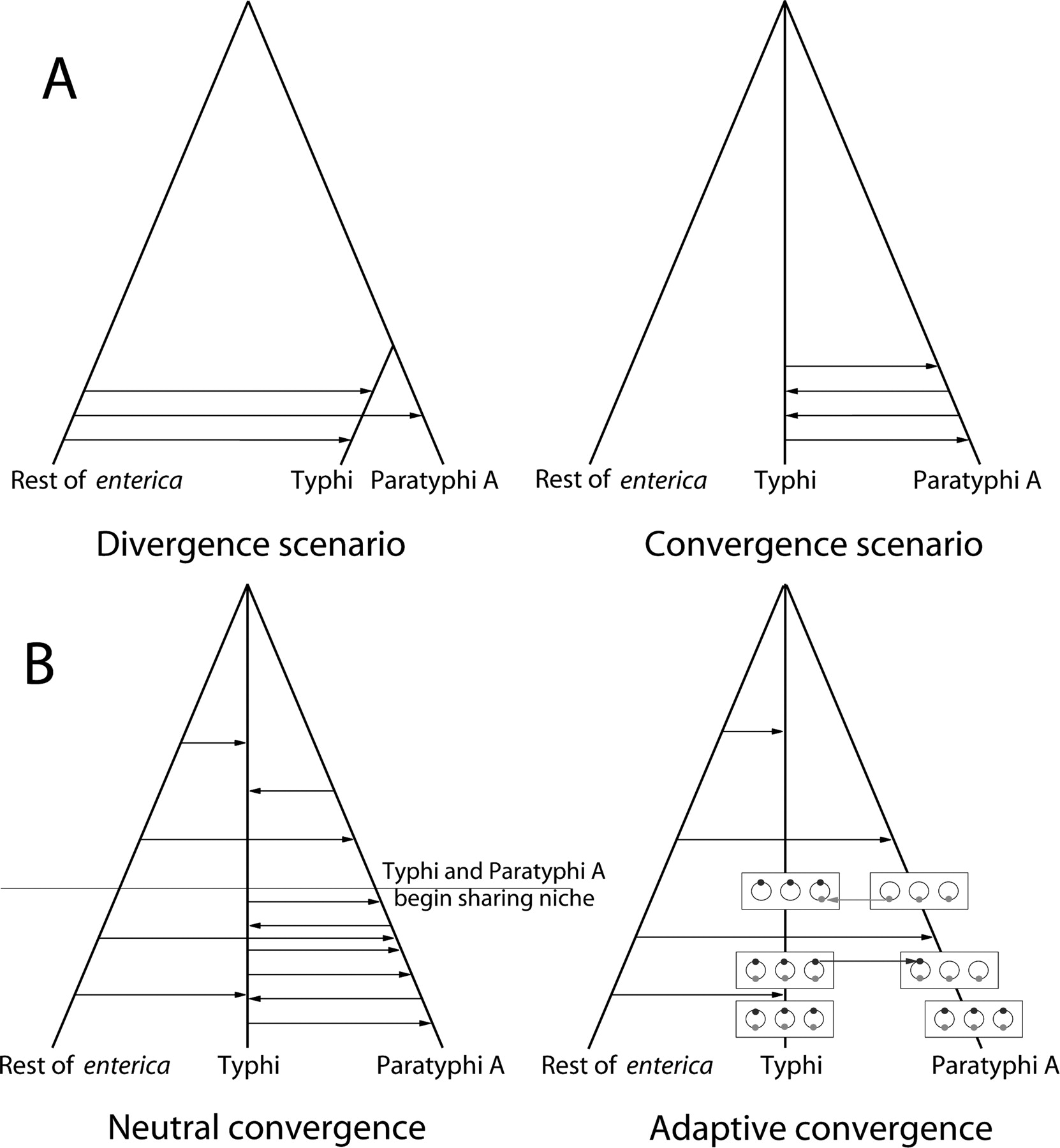 Scenarios for the divergence of Typhi and Paratyphi A. The trees indicate the clonal history and the arrows indicate genetic exchange events. (A) Illustration of the two scenarios that can explain the bimodal distribution of divergence levels (Fig. 1D). (B) Illustration of the two convergence factors. Under neutral convergence, the two lineages converge due to an elevated rate of exchange between them. Under adaptive convergence, exchanges between the two lineages are preferentially fixed because they contain alleles (gray dots), which confer a selective advantage in their common niche.