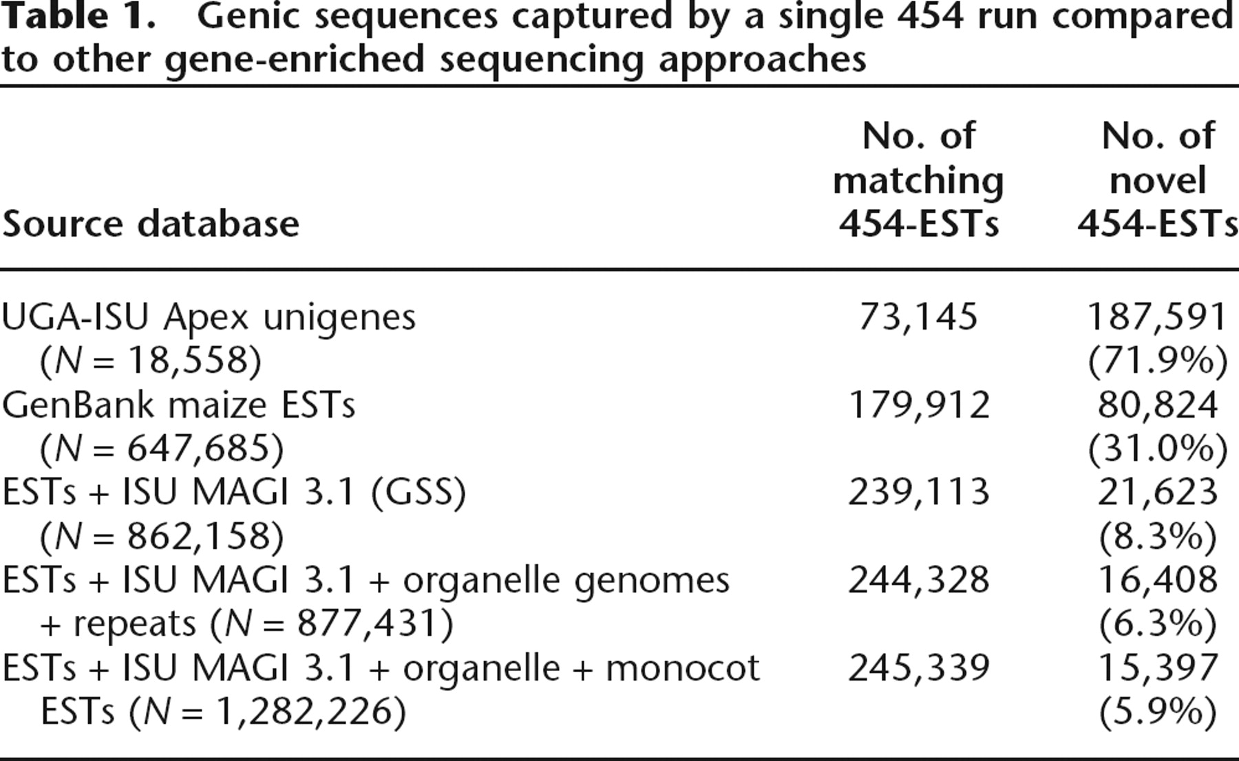 Genic sequences captured by a single 454 run compared to other gene-enriched sequencing approaches