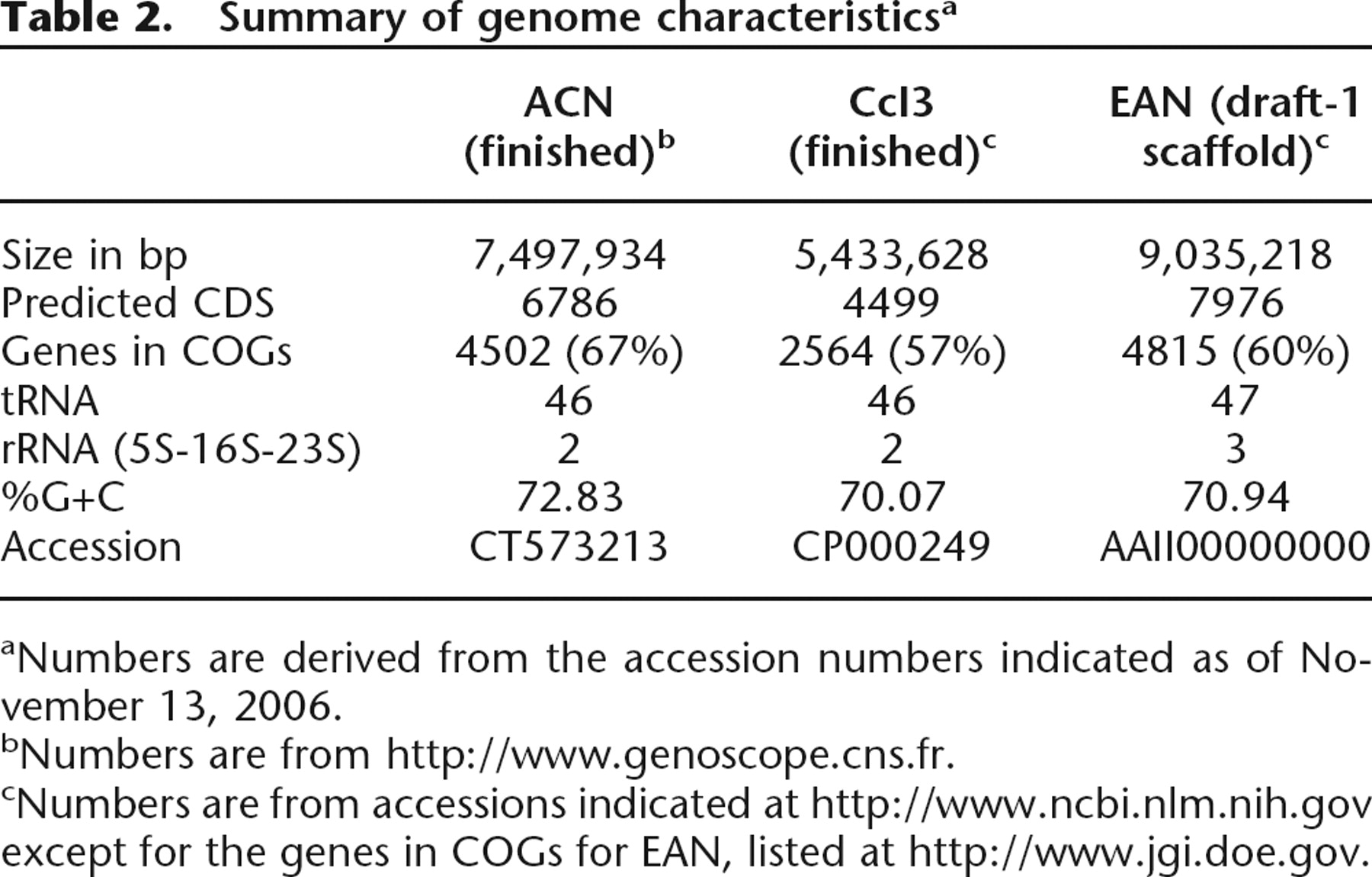 cNumbers are from accessions indicated at http://www.ncbi.nlm.nih.gov except for the genes in COGs for EAN, listed at http://www.jgi.doe.gov.