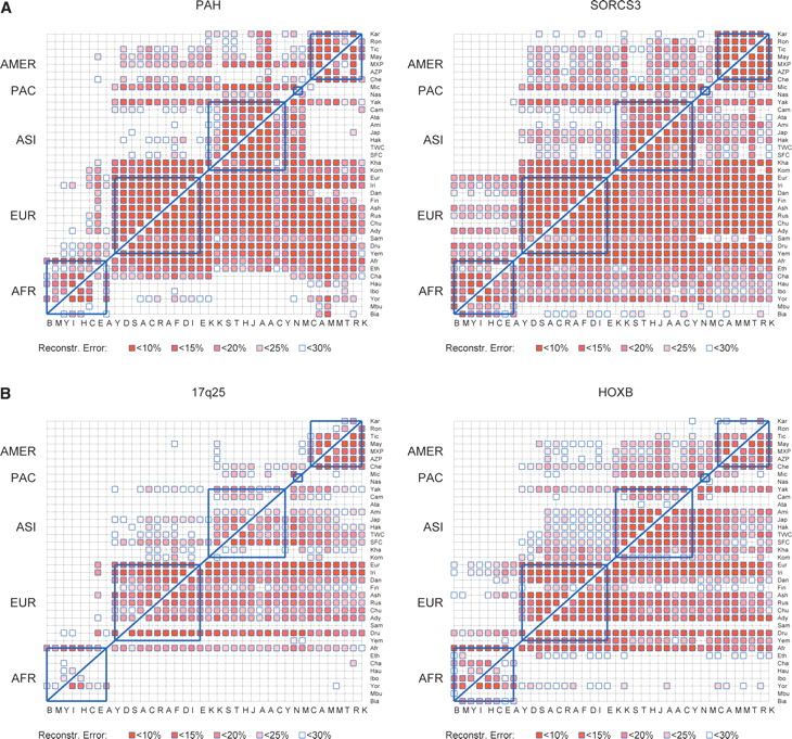 (A,B) Interpopulation reconstruction error (ratio of erroneously predicted entries over total number of predicted entries) for all pairs of populations. Populations are ordered (bottom to top and left to right) based on geographic regions (Africa, Europe, Asia, Micronesia, Americas). The (i, j)-th entry in the plot (i-th row, j-th column) corresponds to the reconstruction error for the j-th population, using the i-th population as reference. The SNPs to be assayed in the j-th population are determined by running the tSNPsMultiPassGreedy algorithm on the i-th population, seeking to explain 99% of the population's spectral variance. Blank entries correspond to reconstruction errors larger than 30%. The five geographic regions of our study are delimited by the blue boxes. (A) PAH and SORCS3; (B) 17q25 and HOXB.