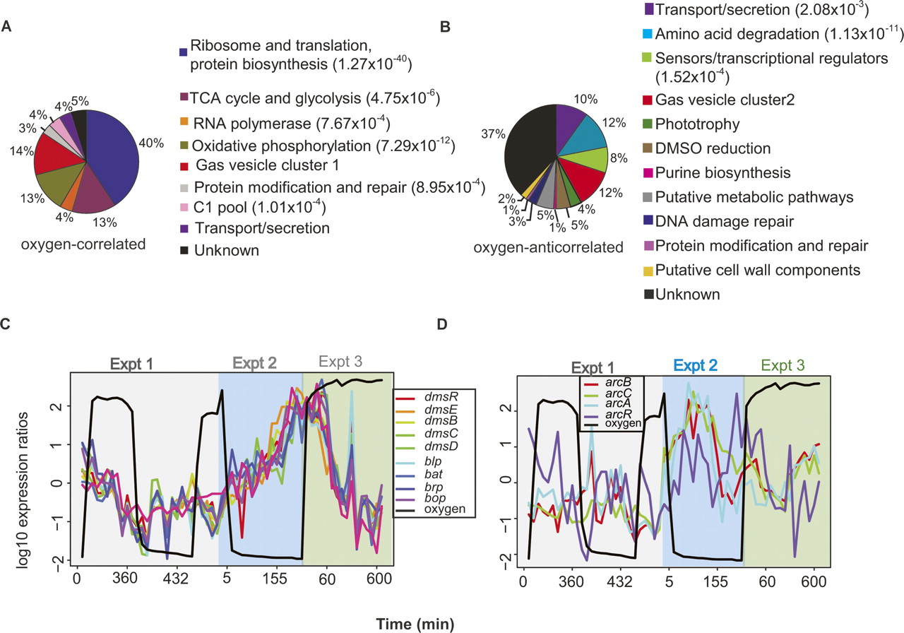 Functional categorization of genes significantly correlated or anticorrelated with oxygen. (A) Functional categories for oxygen-correlated genes. (B) Functional categories for oxygen-anticorrelated genes. Percentages for each slice of the pie chart refer to the fraction of genes from that category that make up the total 106 oxygen-correlated (A) or 109 oxygen-anticorrelated (B) genes. GO and KEGG functional over-representation P-values for these categories are shown in parentheses and Supplemental Tables 1 and 2. Those categories with no P-value were not present in the GO and KEGG database annotations (and are part of the 98 hand-curated annotations described in the Methods). (C) DMSO reduction and bacteriorhodopsin-mediated phototrophy genes are induced by anaerobiosis even in the absence of DMSO or light. Each gene in the pathways is shown, the color-coded profile for which is denoted in the legend. (D) Surprisingly, the arcRABC gene cluster, encoding proteins in the ADI pathway for anaerobic arginine fermentation, is not correlated with oxygen.