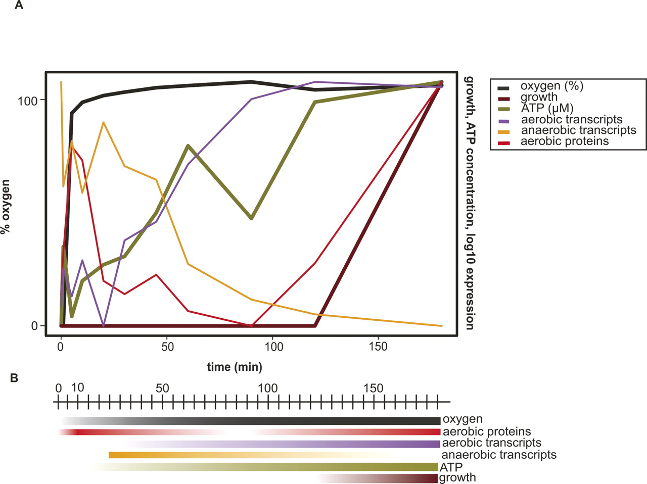 A comprehensive temporal model of molecular events occurring between incidence of oxygen and resumption of growth. (A) Data summary. Oxygen (black line) is plotted against time (X-axis) and overlaid with mean profiles for all 106 significantly oxygen-correlated transcripts (purple line), 109 oxygen-anticorrelated transcripts (orange line), ATP concentrations (green line), growth rate from chemostat experiments (brown line), and protein profiles for all 83 proteins that were detected for oxygen-correlated transcripts (red line). Each line in the graph was plotted on its own scaled Y-axis (data not shown) against time (X-axis) and superimposed on the others for clarity. (B) Dynamic temporal timeline model. Each parameter measured is shown in a colored box corresponding to its time of induction (more intense color) and repression (fading to white).