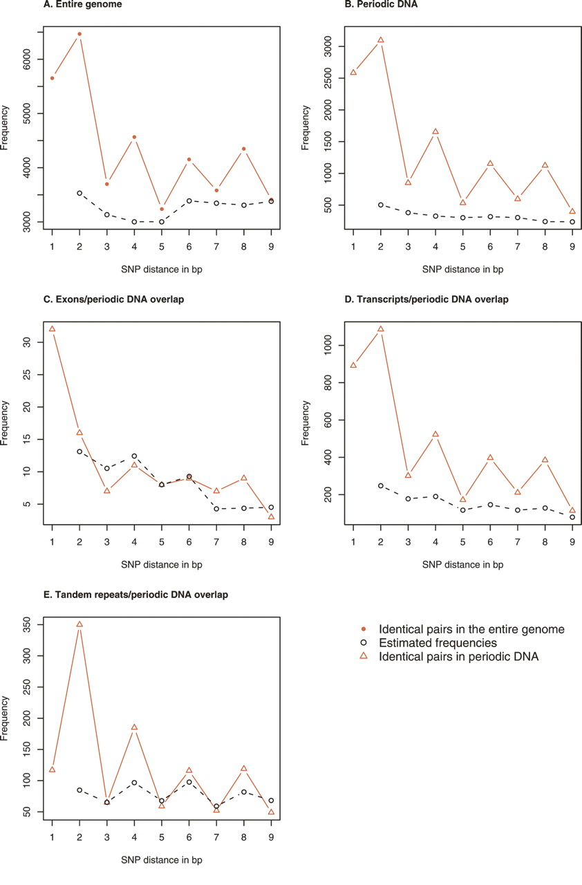 Location of periodic DNA. Estimated and observed frequencies for pairs of identical SNPs in: the entire genome (see Supplemental Fig. S1A for individual chromosomes) (A); periodic DNA (4.3% of the entire genome; see Supplemental Fig. S1B for individual chromosomes) (B); the overlap between exons and periodic DNA (0.06% of the entire genome) (C); the overlap between transcripts and periodic DNA (1.56% of the entire genome) (D); and the overlap between tandem repeats and periodic DNA (0.12% of the entire genome) (E). Because of the over-representation of SNP pairs in distance d = 1, we only estimated the frequencies for d = 2, . . . , 9.