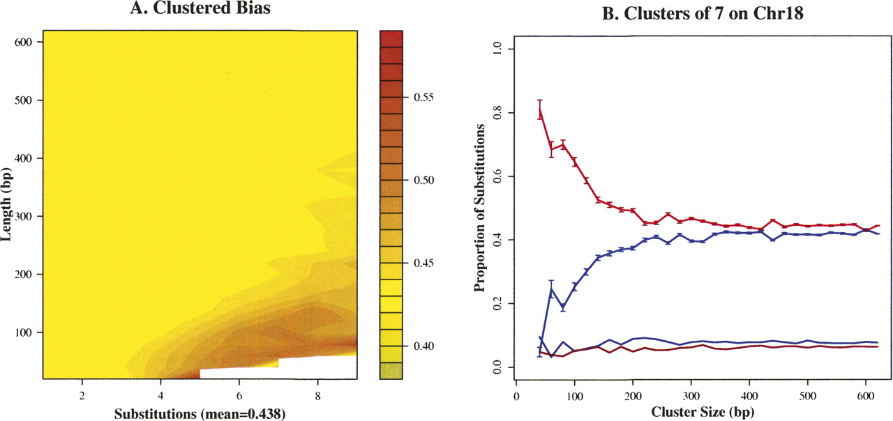 Clusters of substitutions are biased weak (AT) to strong (GC). (A) This heat map shows the proportion of substitutions that are weak-to-strong (color scale) as a function of the local substitution rate for a range of sizes and densities of substitutions. The overall proportion of substitutions that are weak-to-strong is 0.438 genome-wide (yellow). As substitution density approaches 4 or more within 100 bp, the proportion rises to 0.58 (red). (B) Chromosome 18 shows a particularly strong relationship between substitution density and bias, as can be seen for clusters of seven substitutions in the “zipper” plot. A similar pattern was observed on all autosomes. Additional graphics are available at http://www.soe.ucsc.edu/research/compbio/ubcs/.