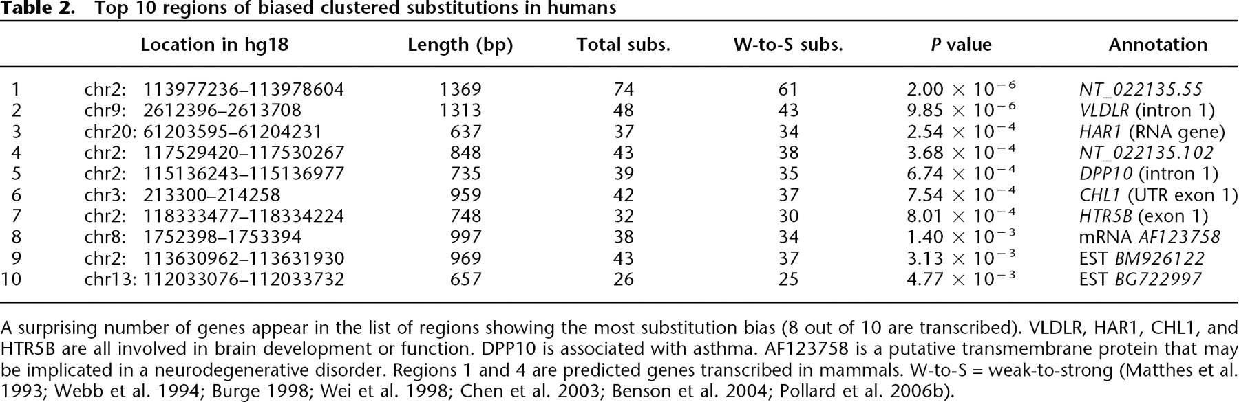 A surprising number of genes appear in the list of regions showing the most substitution bias (8 out of 10 are transcribed). VLDLR, HAR1, CHL1, and HTR5B are all involved in brain development or function. DPP10 is associated with asthma. AF123758 is a putative transmembrane protein that may be implicated in a neurodegenerative disorder. Regions 1 and 4 are predicted genes transcribed in mammals. W-to-S = weak-to-strong (Matthes et al. 1993; Webb et al. 1994; Burge 1998; Wei et al. 1998; Chen et al. 2003; Benson et al. 2004; Pollard et al. 2006b).