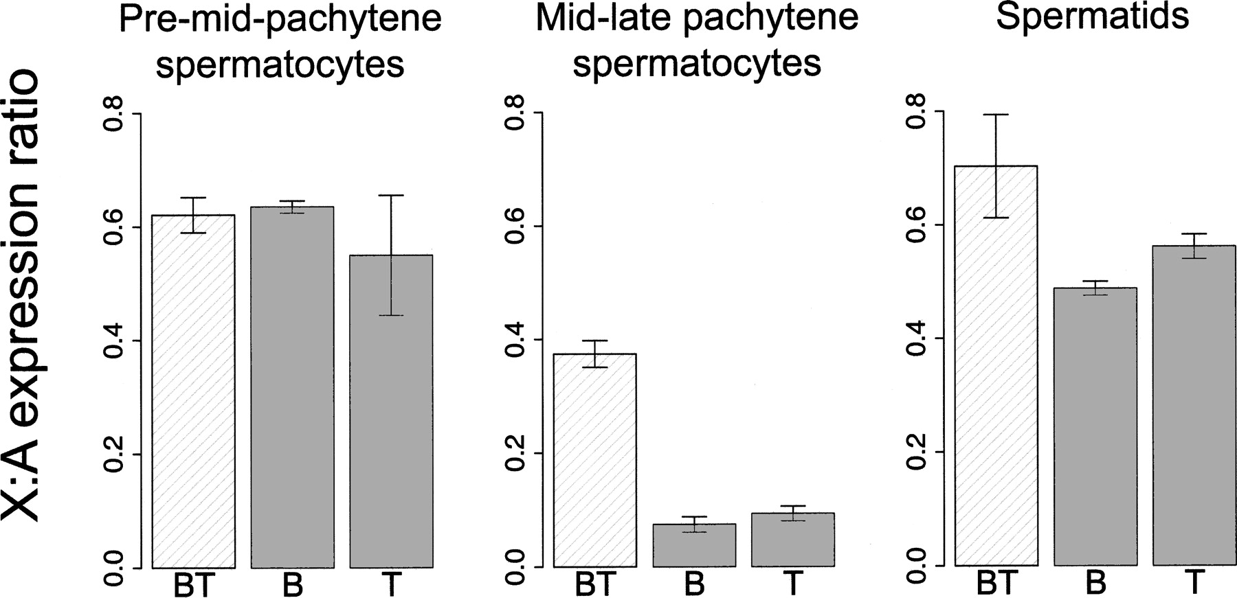 Relaxed silencing of the X chromosome reflected by a high X:autosome transcription ratio in sterile B10-T43/+ males. The X-to-autosome transcription ratios are shown for individual cell populations and mouse genotypes. For each genotype, the mean ratios of two independently isolated populations are displayed together with their range. BT, B, and T stand for B10-T43/+, B10, and B10-T43H/T43H genotypes, respectively.