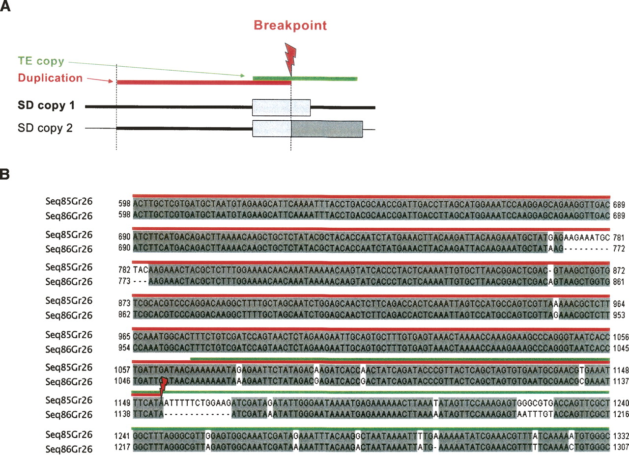 SD breakpoint analysis. (A) This illustrates the NAHR result involving two copies of one TE (the two boxes correspond to the TE copies). Mechanisms of DSB repair according the NAHR models result in a TE copy hybrid. SD breakpoint is thus expected to be located in the copy TE at SD ends. (B) One example. The multiple alignment illustrated corresponds to SD breakpoint region. The breakpoint is shown by the transition from a conserved to a less-conserved region. The conserved region indicates the duplicated region (underlined in red).