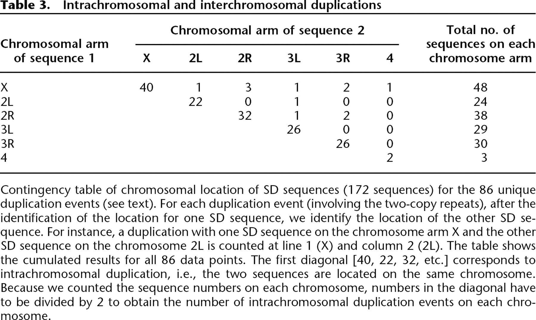 Contingency table of chromosomal location of SD sequences (172 sequences) for the 86 unique duplication events (see text). For each duplication event (involving the two-copy repeats), after the identification of the location for one SD sequence, we identify the location of the other SD sequence. For instance, a duplication with one SD sequence on the chromosome arm X and the other SD sequence on the chromosome 2L is counted at line 1 (X) and column 2 (2L). The table shows the cumulated results for all 86 data points. The first diagonal [40, 22, 32, etc.] corresponds to intrachromosomal duplication, i.e., the two sequences are located on the same chromosome. Because we counted the sequence numbers on each chromosome, numbers in the diagonal have to be divided by 2 to obtain the number of intrachromosomal duplication events on each chromosome.