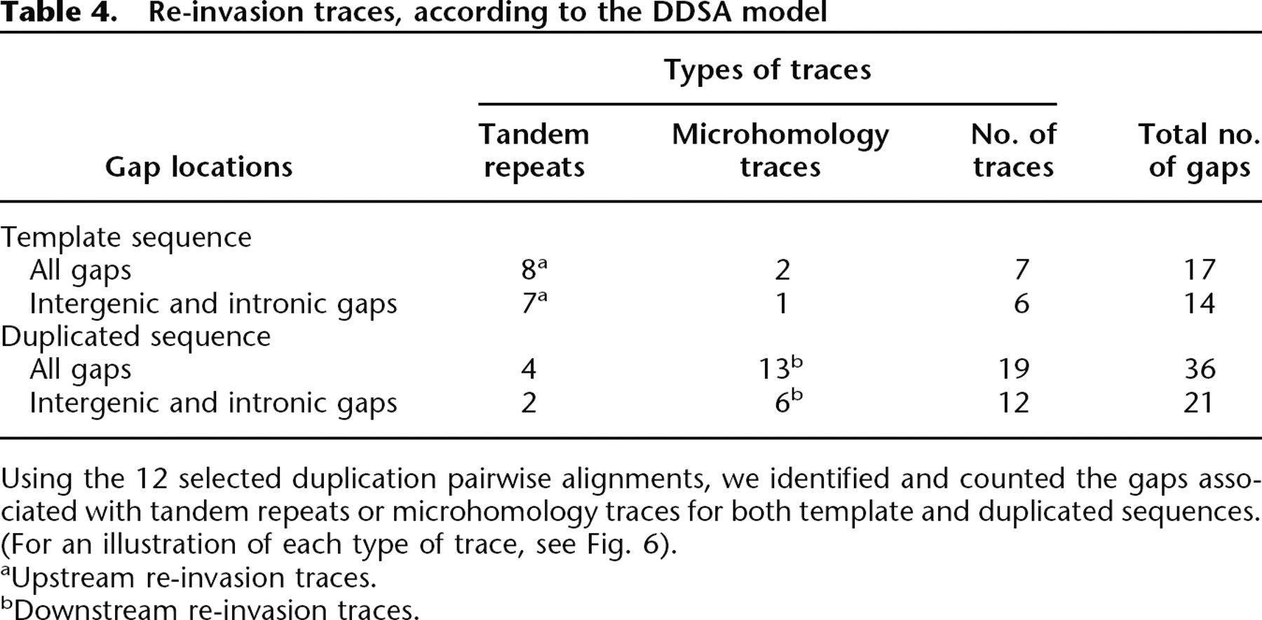 Using the 12 selected duplication pairwise alignments, we identified and counted the gaps associated with tandem repeats or microhomology traces for both template and duplicated sequences. (For an illustration of each type of trace, see Fig. 6).