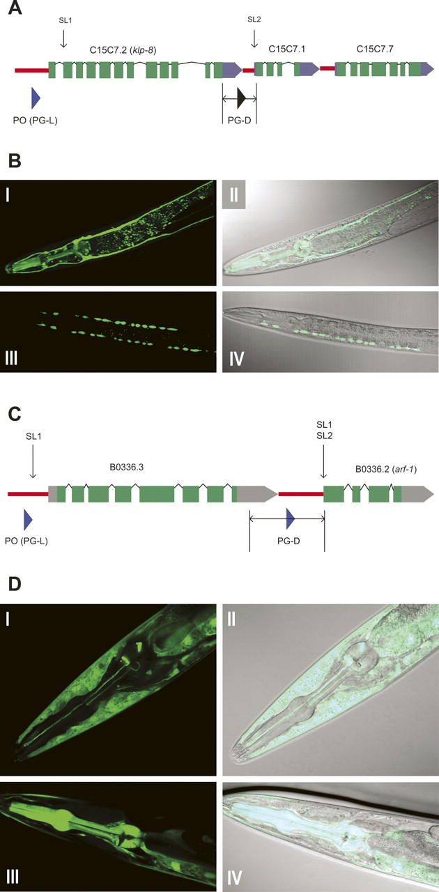 Schematic diagrams and expression patterns of the CEOPX040 (klp-8) operon and the CEOP3332 operon. (A) The klp-8 operon. Both the operon promoter (PG-L) for the leading gene C15C7.2 and the internal promoter (PG-D) for the downstream gene C15C7.1 have been extracted. (Green rectangles) Exons; (thin lines) introns; (thick red lines) intergenic regions; (gray areas) UTRs. (PO) The promoter of an operon; (PG-L) a promoter∷GFP constructed from the leading gene of an operon; (PG-D) a promoter∷GFP constructed from the corresponding operon downstream gene. (B) I and II show that the promoter extracted from leading gene C15C7.2 is able to drive GFP expression in the excretory cell, pharynx, pharyngeal neurons, and head neurons, while the promoter extracted from downstream gene C15C7.1 directs GFP expression in the seam cells (III and IV). (C) The CEOP3332 operon. Both the operon promoter and the internal promoter for downstream gene B0336.2 are used to construct GFP fusions. (D) I and II show that the promoter extracted from leading gene B0336.3 is able to drive GFP expression in hypodermis, pharyngeal gland cell, gut, and nerve ring, while that of downstream gene B0336.2 is able to drive GFP expression in the pharynx, gut, and head neurons (III and IV).