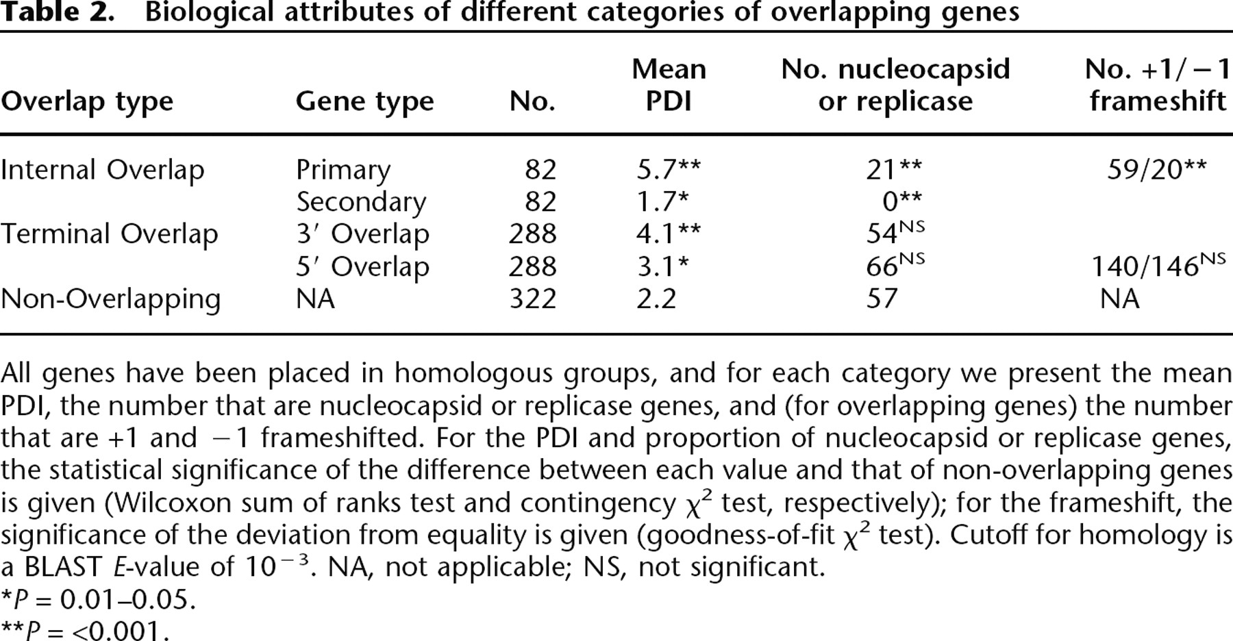 All genes have been placed in homologous groups, and for each category we present the mean PDI, the number that are nucleocapsid or replicase genes, and (for overlapping genes) the number that are +1 and −1 frameshifted. For the PDI and proportion of nucleocapsid or replicase genes, the statistical significance of the difference between each value and that of non-overlapping genes is given (Wilcoxon sum of ranks test and contingency χ2 test, respectively); for the frameshift, the significance of the deviation from equality is given (goodness-of-fit χ2 test). Cutoff for homology is a BLAST E-value of 10−3. NA, not applicable; NS, not significant.