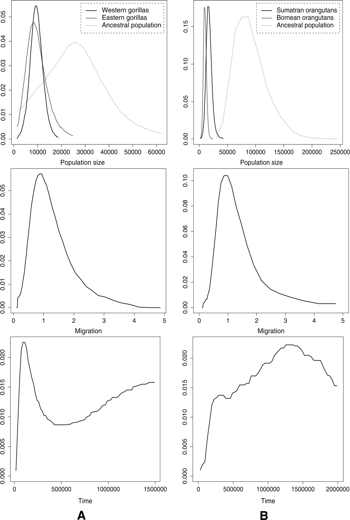 Smoothed marginal posterior distributions estimated by MIMAR from the gorilla (A) and orangutan (B) subspecies polymorphism data (for details, see Methods and legend of Fig. 2). (A) Distributions for the analysis of Western and Eastern gorillas. The apparent multimodality of the marginal posterior distribution estimated for the split time was also noted by Thalmann et al. (2006). (B) Distributions for the analysis of Sumatran and Bornean orangutans. Note that the posterior distribution for the split time is rather flat, suggesting that the data do not carry much information about this parameter.