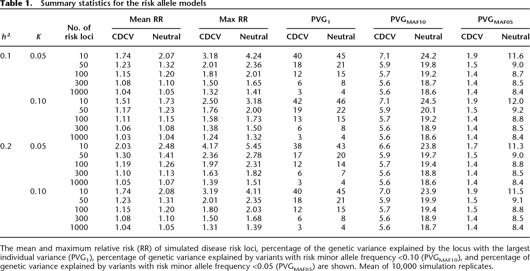 The mean and maximum relative risk (RR) of simulated disease risk loci, percentage of the genetic variance explained by the locus with the largest individual variance (PVG1), percentage of genetic variance explained by variants with risk minor allele frequency <0.10 (PVGMAF10), and percentage of genetic variance explained by variants with risk minor allele frequency <0.05 (PVGMAF05) are shown. Mean of 10,000 simulation replicates.