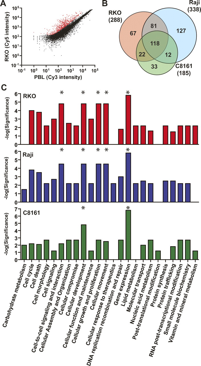 Detection of DNA methylation by MCAM. (A) Scatterplot of Cy5 versus Cy3 intensity values for each probe showing the segregation of methylated (red spots) from unmethylated (black spots) in the colon cancer cell line RKO compared to normal peripheral blood lymphocytes. (B) Venn diagram representing the overlap and differences in methylated probes for the cancer cell lines RKO, Raji, and C8161. Note that a large number of loci are exclusively methylated in each individual cell line. (C) Comparison of significant representation of altered functional categories in cancer cell lines inferred by the presence of methylated genes network. The most significant categories in each cell line are labeled with asterisks (*). Note that “Gene expression” function is affected in all three cell lines, which is because of a large fraction of methylated transcription factors among all identified genes by MCAM.
