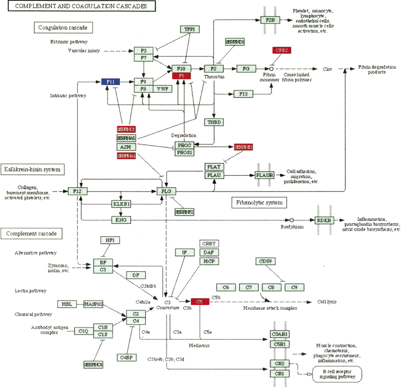 The complement and coagulation cascade as affected by treatment with palmitate in a hepatic cell line. There are seven differentially expressed genes (red, up-regulated; blue, down-regulated) out of 69 total genes. All classical ORA models would give any other pathway with the same proportion of genes a similar P-value, disregarding the fact that six out of these seven genes are involved in the same region of the pathway, closely interacting with each other. Both ORA and GSEA would yield exactly the same significance value to this pathway even if the diagram were to be completely redesigned by future discoveries. In contrast, the impact factor can distinguish between this pathway and any other pathway with the same proportion of differentially expressed gene, as well as take into account any future changes to the topology of the pathway.
