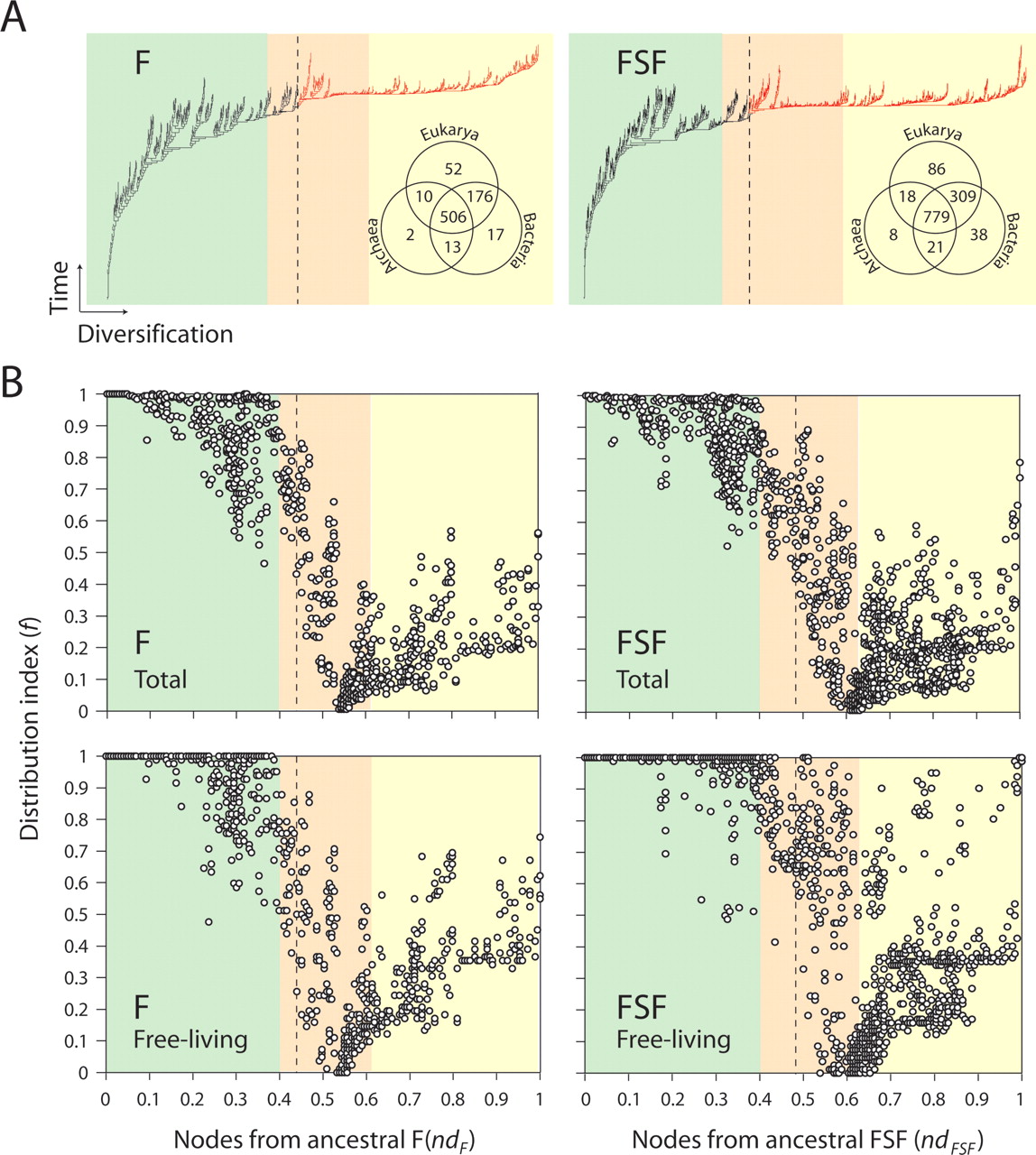 Architectural chronologies of (F) folds (left) and (FSF) fold superfamilies (right) suggest three evolutionary epochs in the timeline of the protein world. (A) Optimal (P < 0.01) most-parsimonious F (85,644 steps; CI = 0.043, RI = 0.770; g1 = −0.134) and FSF (118,119 steps; CI = 0.031, RI = 0.759; g1 = −0.099) trees were reconstructed from a protein domain census in 185 completely sequenced genomes. Venn diagrams show occurrence of architectures in the three superkingdoms of life, Archaea (A), Bacteria (B), and Eukarya (E). Terminal leaves were not labeled, as they would not be legible. (Red) Branches defining F and FSF that occur after the appearance of the first architecture unique to a superkingdom (B). (B) Distribution index of individual architectures (f, the number of species using an architecture/total number of species) against the age of architectures (nd, number of nodes from the root/total number of nodes in the tree) uncovers evolutionary patterns of architectural innovation and usage when studying all genomes or only those that are free-living. Based on these patterns, we propose three evolutionary epochs of the protein world: (light green) structural diversification; (salmon) superkingdom specification; (yellow) organismal diversification epochs.