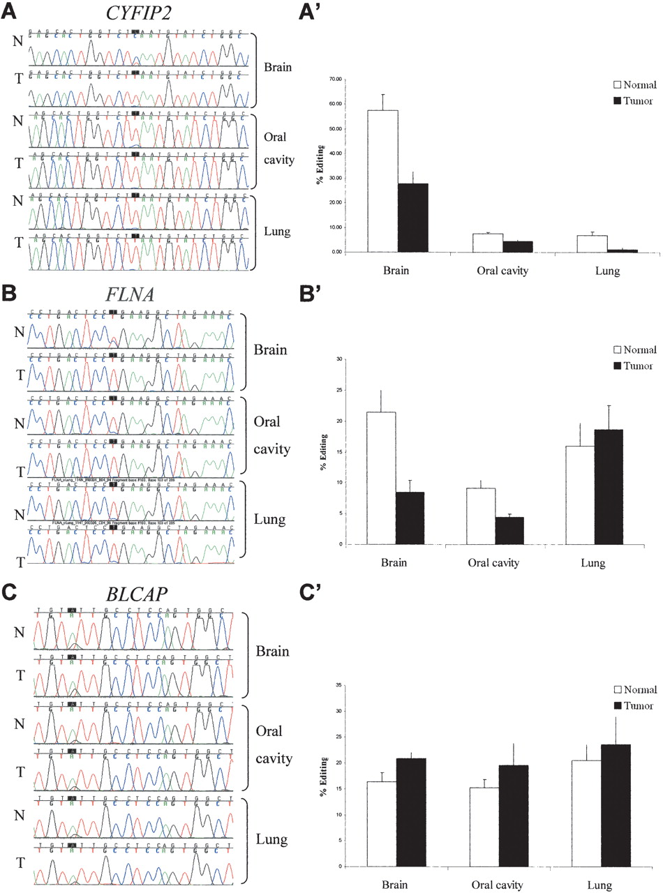 Site-specific editing at coding sequences in normal vs. tumor tissues; direct sequencing of the CYFIP2, FLNA, and BLCAP genes (A–C) from representative samples taken from normal and cancer tissues (brain, oral cavity, and lung). Editing position is indicated by a black box. A-to-I editing is detected as guanosine trace when products were sequenced with the forward primer and as cytidine trace when reverse primer was used for sequencing. Paired normal and tumor tissues from lung and oral cavity were taken from the same individual. (A′–C′) Average editing levels of CYFIP2, FLNA, and BLCAP in normal and cancer tissues. Normal and tumor samples are indicated by white and black bars, respectively. Error bars represent SEM (A–A′) CYFIP2 shows the highest editing percentages in brain tissues, with pronounced 2.4-fold higher editing levels in normal vs. tumor brains (51.5% [n = 13] and 22.3% [n = 27], respectively; P = 0.002). (B–B′) Highest editing percentages of FLNA were detected in the brain tissue, with a significant 2.4-fold higher editing in normal vs. tumor brains (21.4% [n = 13] and 8.8% [n = 31], respectively; P = 0.0001). (C–C′) Minor increase in editing level of BLCAP is detected in different types of tumors, with 1.3-fold (P = 0.03) in the brain (20.9% [n = 24] and 16.4% [n = 12], respectively; P = 0.03).