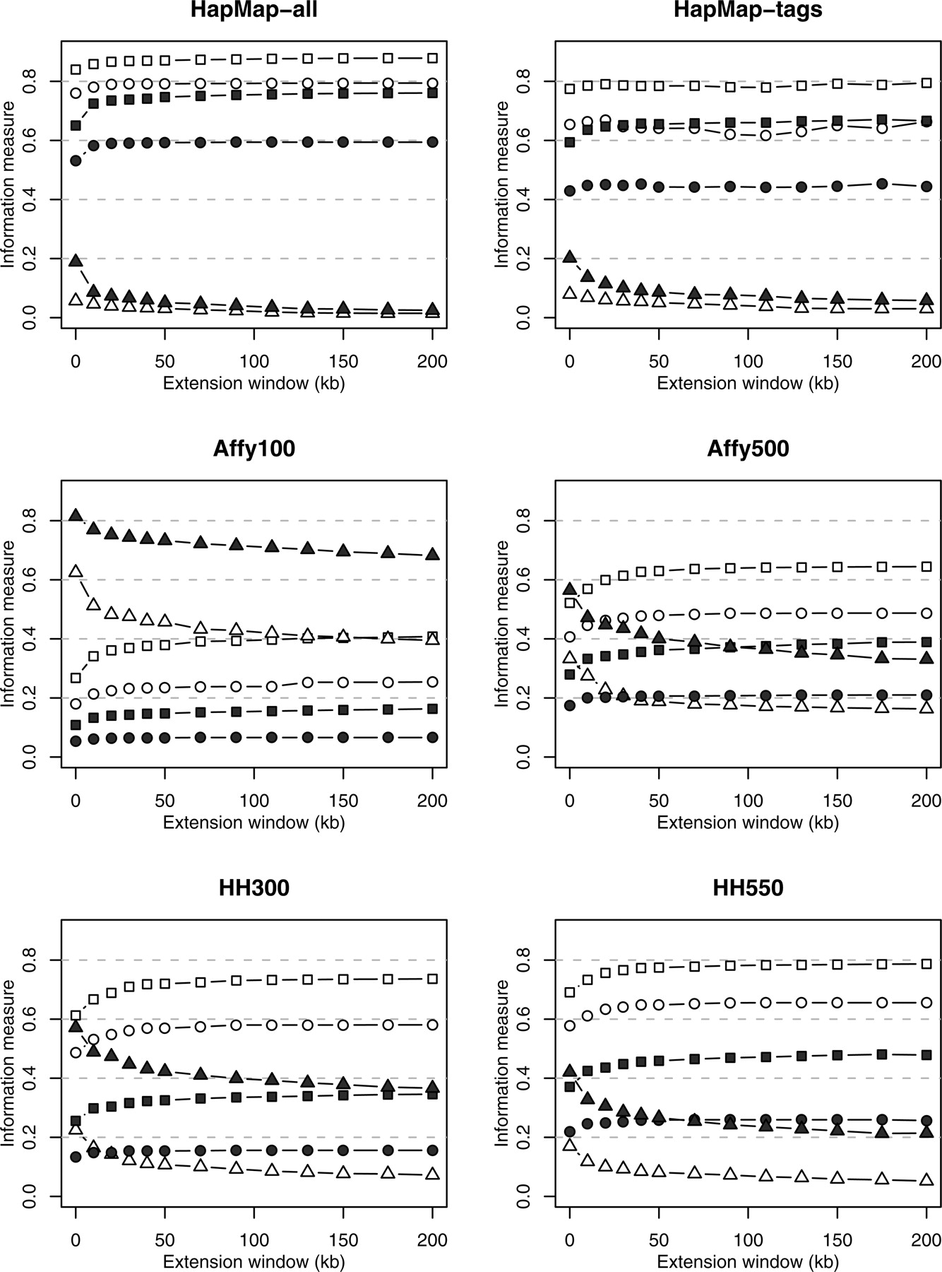 Information measures for 78 genes using combined SeattleSNPs/PARC and HapMap data for extension windows of 0–200 kb around the sequenced region. Mean maximum r2, capture rates, and noncapture rates are shown by squares, circles, and triangles, respectively; European and African descent samples are distinguished by solid and open symbols, respectively.