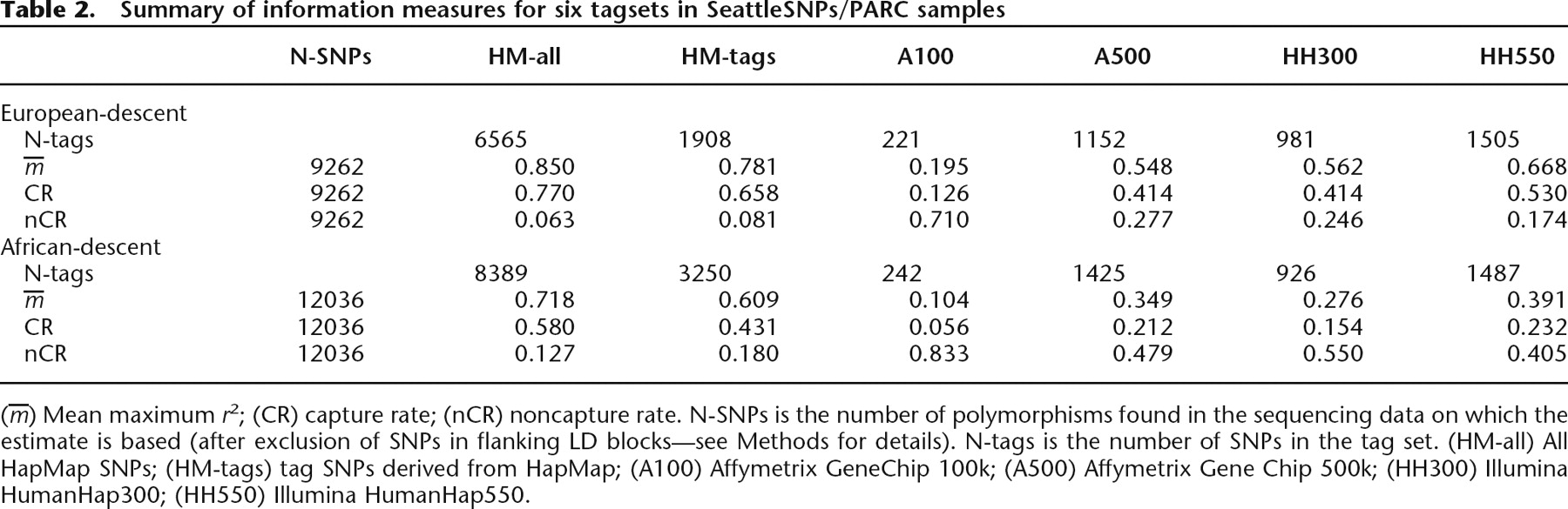 (m̅) Mean maximum r2; (CR) capture rate; (nCR) noncapture rate. N-SNPs is the number of polymorphisms found in the sequencing data on which the estimate is based (after exclusion of SNPs in flanking LD blocks—see Methods for details). N-tags is the number of SNPs in the tag set. (HM-all) All HapMap SNPs; (HM-tags) tag SNPs derived from HapMap; (A100) Affymetrix GeneChip 100k; (A500) Affymetrix Gene Chip 500k; (HH300) Illumina HumanHap300; (HH550) Illumina HumanHap550.