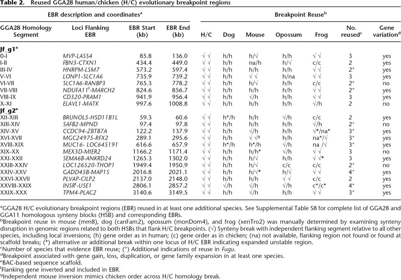 bBreakpoint reuse in mouse (mm8), dog (canFam2), opossum (monDom4), and frog (xenTro2) was manually determined by examining synteny disruption in genomic regions related to both HSBs that flank H/C breakpoints. (√) Synteny break with independent flanking segment relative to all other species, including local inversions; (h) gene order as in human; (c) gene order as in chicken; (na) not available, flanking region not found or found at scaffold breaks; (*) alternative or additional break within one locus of H/C EBR indicating expanded unstable region.