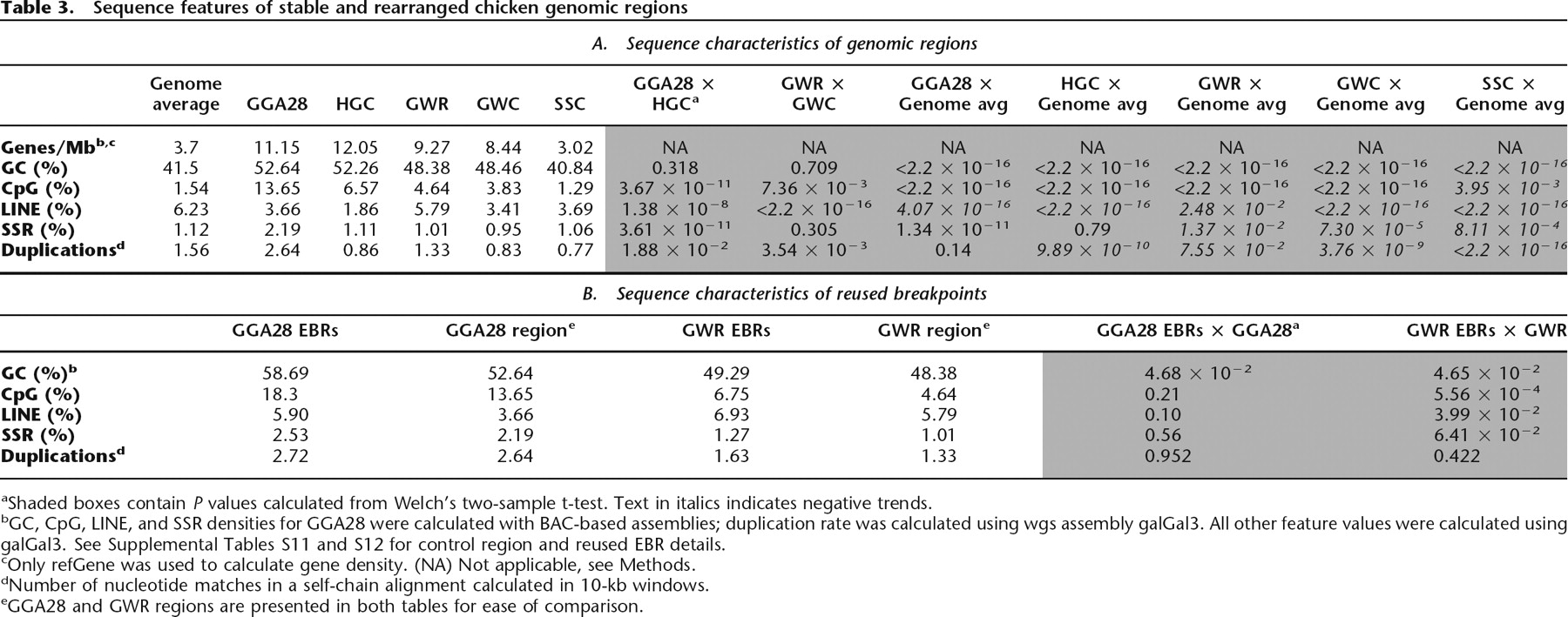 bGC, CpG, LINE, and SSR densities for GGA28 were calculated with BAC-based assemblies; duplication rate was calculated using wgs assembly galGal3. All other feature values were calculated using galGal3. See Supplemental Tables S11 and S12 for control region and reused EBR details.
