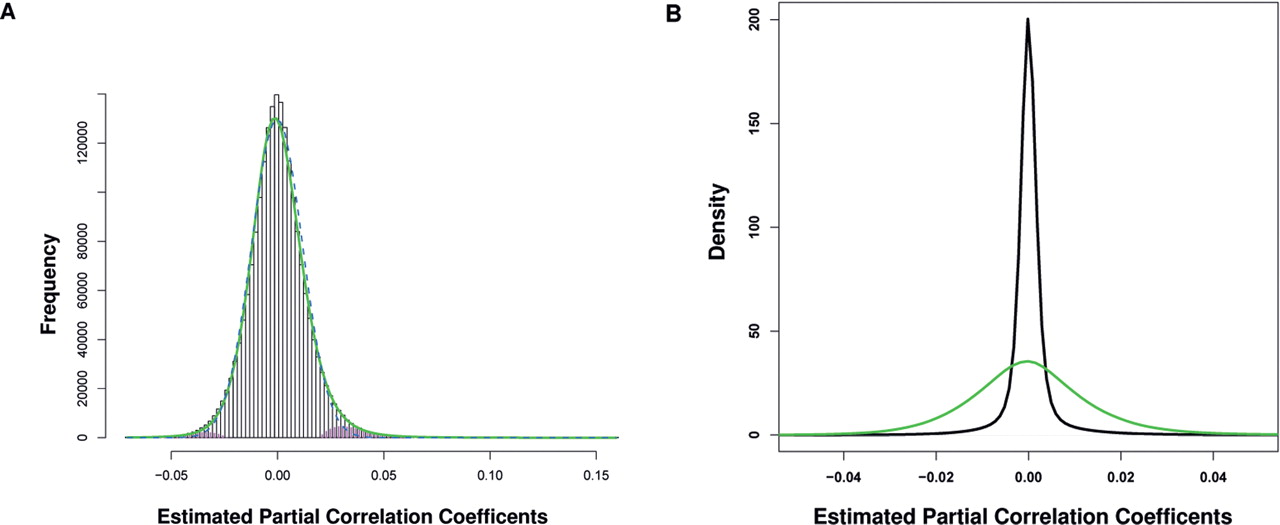 The distribution of estimated partial correlations. (A) Distribution of pcors for 2000 named and at least partially studied genes. (Bars) Histogram; (green line) distribution of estimated pcor after Fisher’s normalizing z-transformation; (dashed blue line) fitted null distribution; (pink) alternative distribution, inferred by the locfdr algorithm (Efron 2004, 2007). (B) Comparison of the pcor distribution in the pilot experiment (green line) and the expanded calculation (dark line). Shown is the area between –0.05 and 0.05. Densities were calculated using the kernel density estimator embedded in R, with the bandwidth set to 0.001.