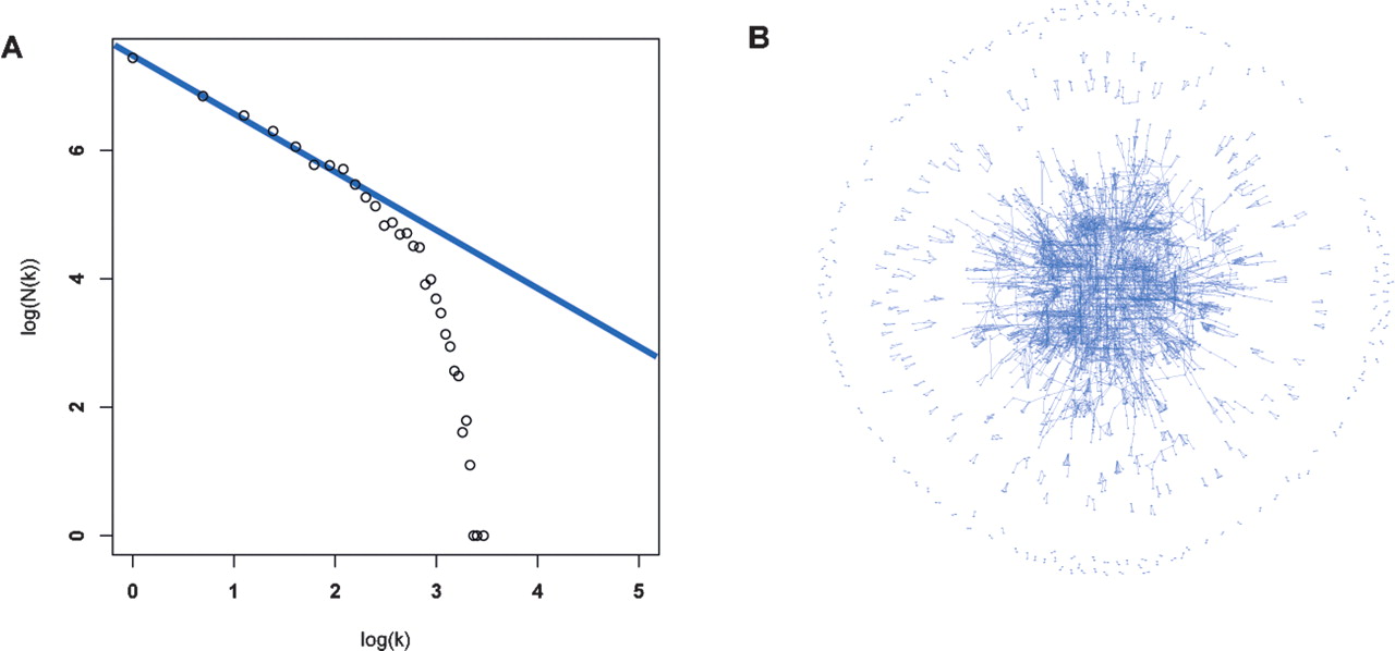Connectivity and network structure. (A) The connectivity distribution for the expanded network (k) Connectivity; (N(k)) number of nodes with connectivity k. The line indicates the distribution expected for a network following the power law. (B) An overview of the network (with 5000 edges included), as generated by the tYNA platform.