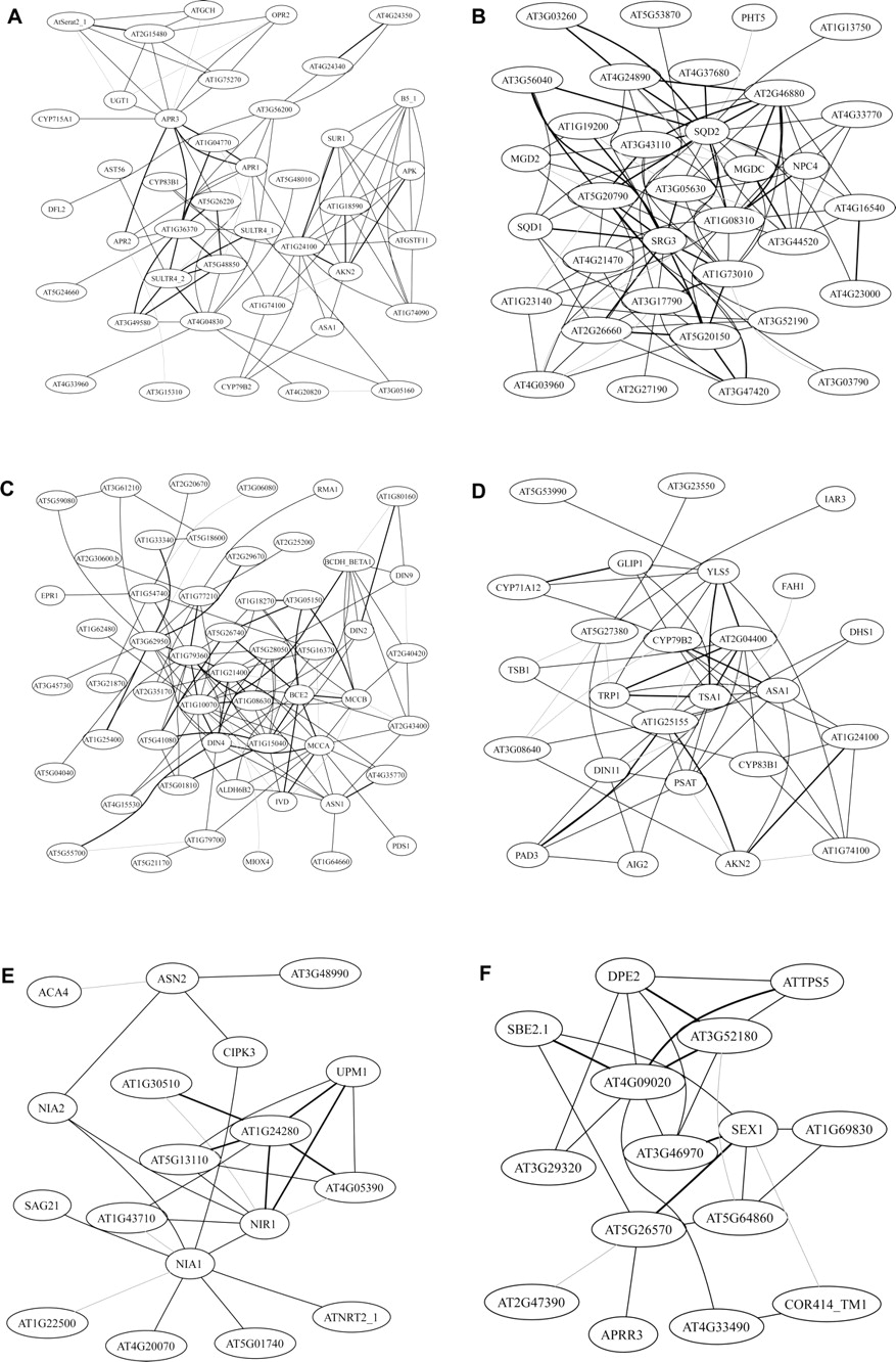 Subnetworks extracted from the expanded network. The examples are centered on (A) APR1; (B) SQD1; (C) DIN4; (D) TRP1; (E) NIA2; and (F) SBE2.1. Symbols as in Figure 2.