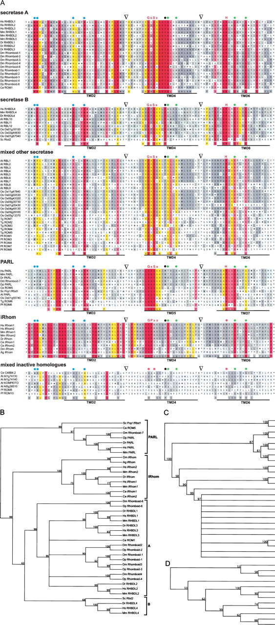 Accession numbers: For human, mouse, and Arabidopsis rhomboids, see Table S1; for details of the rice genes, see MIPS plant genome database (http://mips.gsf.de/projects/plants/). The accession number for zebrafish (D. rerio, Dr) RHBDL1 is Ensembl:ENSDARP00000082440, Dr RHBDL2 is Swiss-Prot:Q7ZUN9, Dr RHBDL3 is Swiss-Prot:Q566N3, Dr RHBDL4 is Swiss-Prot:Q568J3, and Dr PARL is Ensembl:ENSDARP00000057438; D. melanogaster (Dm) Rhomboid-1 is Swiss-Prot:P20350, Dm Rhomboid-2 is Swiss-Prot:Q86P37, Dm Rhomboid-3 is Swiss-Prot:Q9W0F8, Dm Rhomboid-4 is Swiss-Prot:Q9VYW6, Dm Rhomboid-6 is Swiss-Prot:Q86BL6, and Dm Rhomboid-7 (PARL) is Swiss-Prot:A1Z8R8; D. pseudoobscura (Dp) Rhomboid-1 is GenBank:EAL31292, Dp Rhomboid-2 is GenBank:EAL31289, Dp Rhomboid-3 is GenBank:EAL31296, Dp Rhomboid-4 is GenBank:EAL32611, Dp Rhomboid-6 is GenBank:EAL33827, and Dp PARL is GenBank:EAL25960; C. elegans (Ce) ROM1 is Swiss-Prot:Q19821 and Ce ROM5 (PARL) is GenBank:NP_491125; S. cerevisiae (Sc) Rbd2 is Swiss-Prot:Q12270 and Sc Pcp1/Rbd1 (PARL) is Swiss-Prot:P53259; T. gondii (Tg) ROM1 is Swiss-Prot:Q695U0, Tg ROM2 is Swiss-Prot:Q695T9, Tg ROM3 is Swiss-Prot:Q6IUY1, Tg ROM4 is Swiss-Prot:Q695T8, Tg ROM5 is Swiss-Prot:Q6GV23, and Tg ROM6 (PARL) is Swiss-Prot:Q2PP52; P. falciparum (Pf) ROM1 is GenBank:AAN35734, Pf ROM3 is GenBank:CAD51095, Pf ROM4 is GenBank:CAD51434, Pf ROM6 (PARL) is GenBank:CAD52576, Pf ROM7 is GenBank:CAD52703, and Pf ROM9 is GenBank:CAD51515. Note that there is no ROM2 and ROM5 annotated in P. falciparum (for details, see Dowse and Soldati 2005). For the accession numbers for the iRhoms, see Figure 5. The accession numbers for the inactive rhomboid homologs are Swiss-Prot:P34356 for Ce C48B4.2, GenBank:AAN36722 for Pf ROM8, and GenBank: CAG25001 for Pf ROM10; for the Arabidopsis proteins, see Table S1.