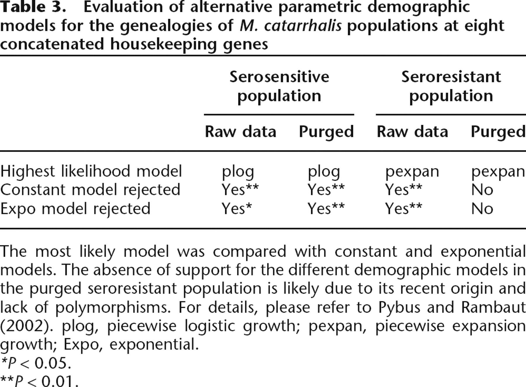 Evaluation of alternative parametric demographic models for the genealogies of M. catarrhalis populations at eight concatenated housekeeping genes