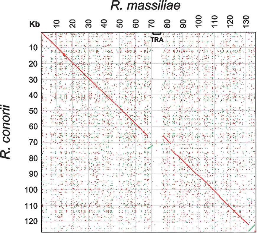 Dot-plot comparison of the R. massiliae and R. conorii genomes. Red and green dots represent forward and reverse BLASTN matches, respectively (E-value value < 1 × 10−5). Position of the tra cluster is indicated in gray.